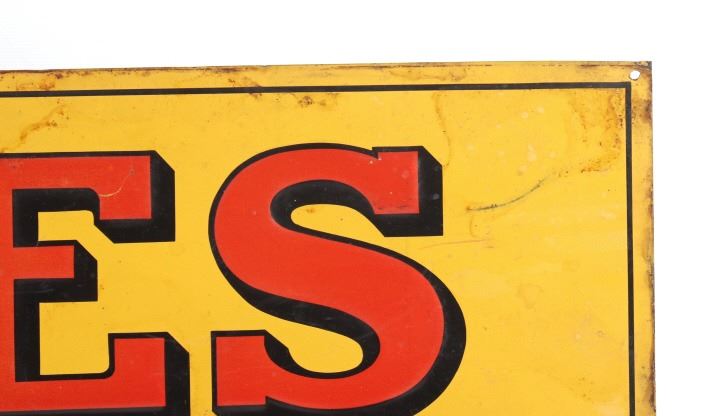 Offered in this lot we have a Dines Quality Coal Metal Advertising sign originating from the mid to late 20th century. The sign features a yellow field with black and orange lettering. The left side of the sign is marked "Dines - Much Better Preparation - Coal - Unvarying Quality - Service" with the right side marked "Dines Quality Coal". The sign was located near Rock Springs in Wyoming. The sign shows good condition overall with some wear across the face of the piece due to age. The sign measures 27 7/8" wide by 7 3/4" tall.