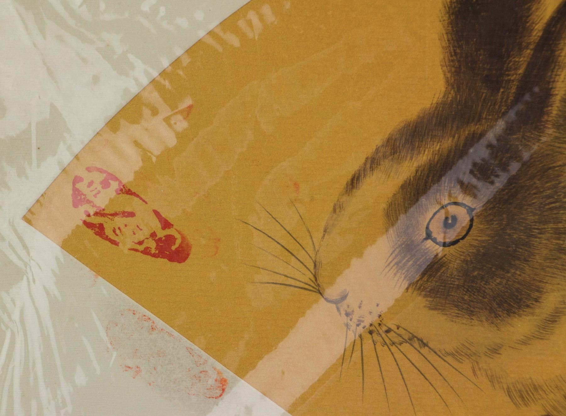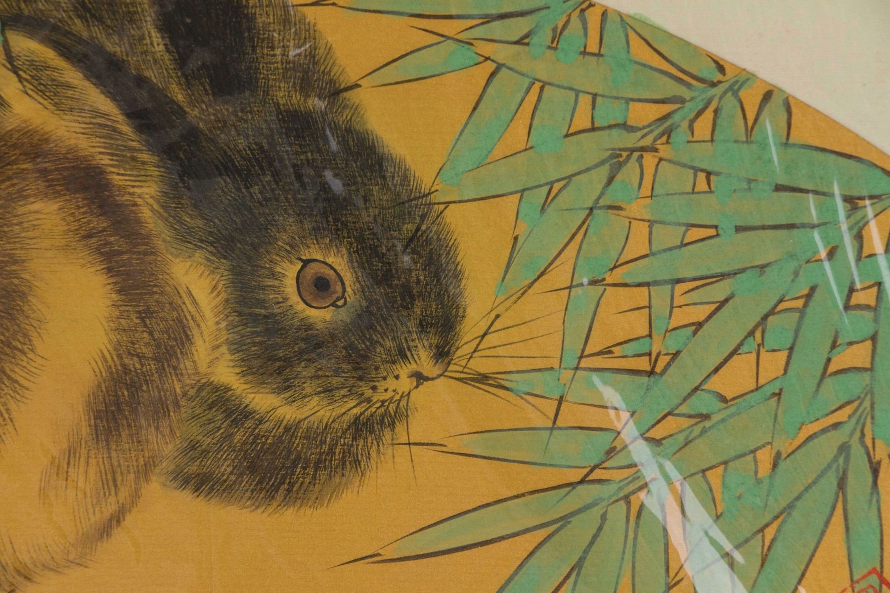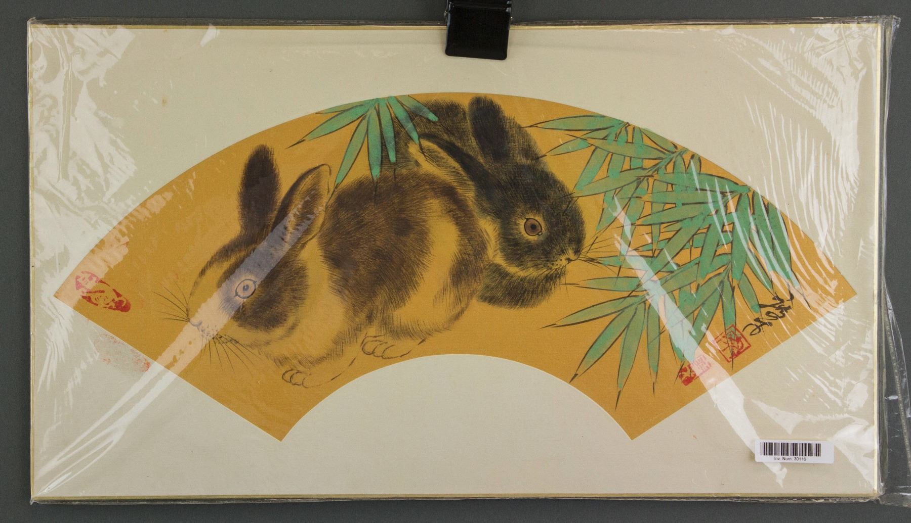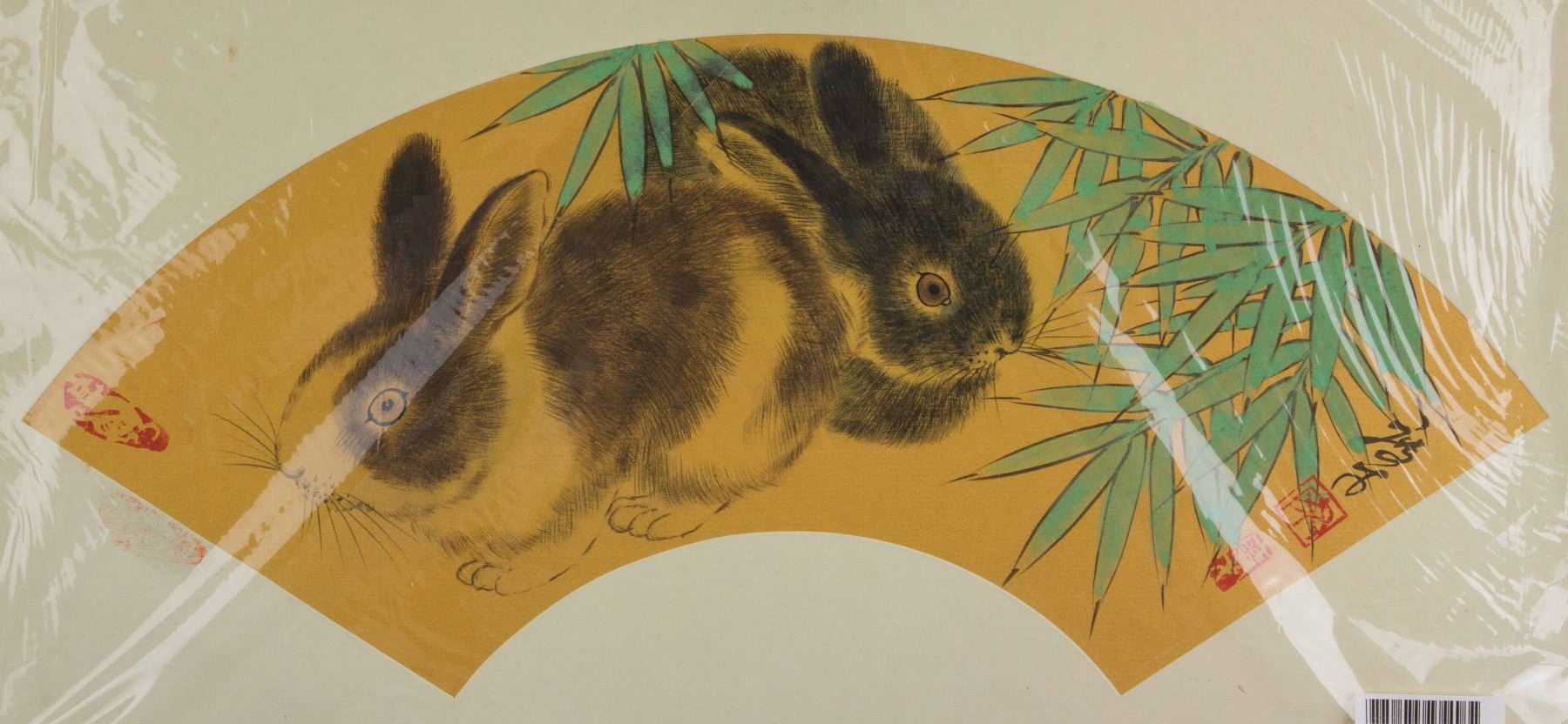 Rabbits and bamboo; Chinese ink and watercolour on fan shape paper; mounted on board; signed Ding Ducai (b.1974); inscribed with 3 artist seals; 18.5 cm x 45.5 cm