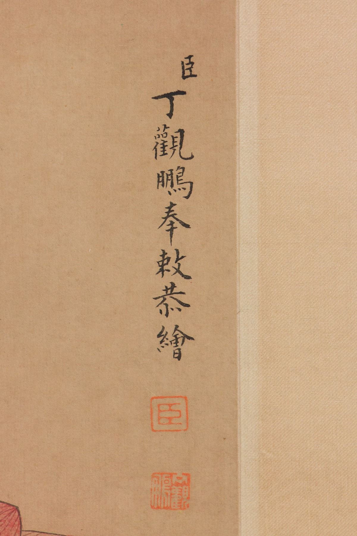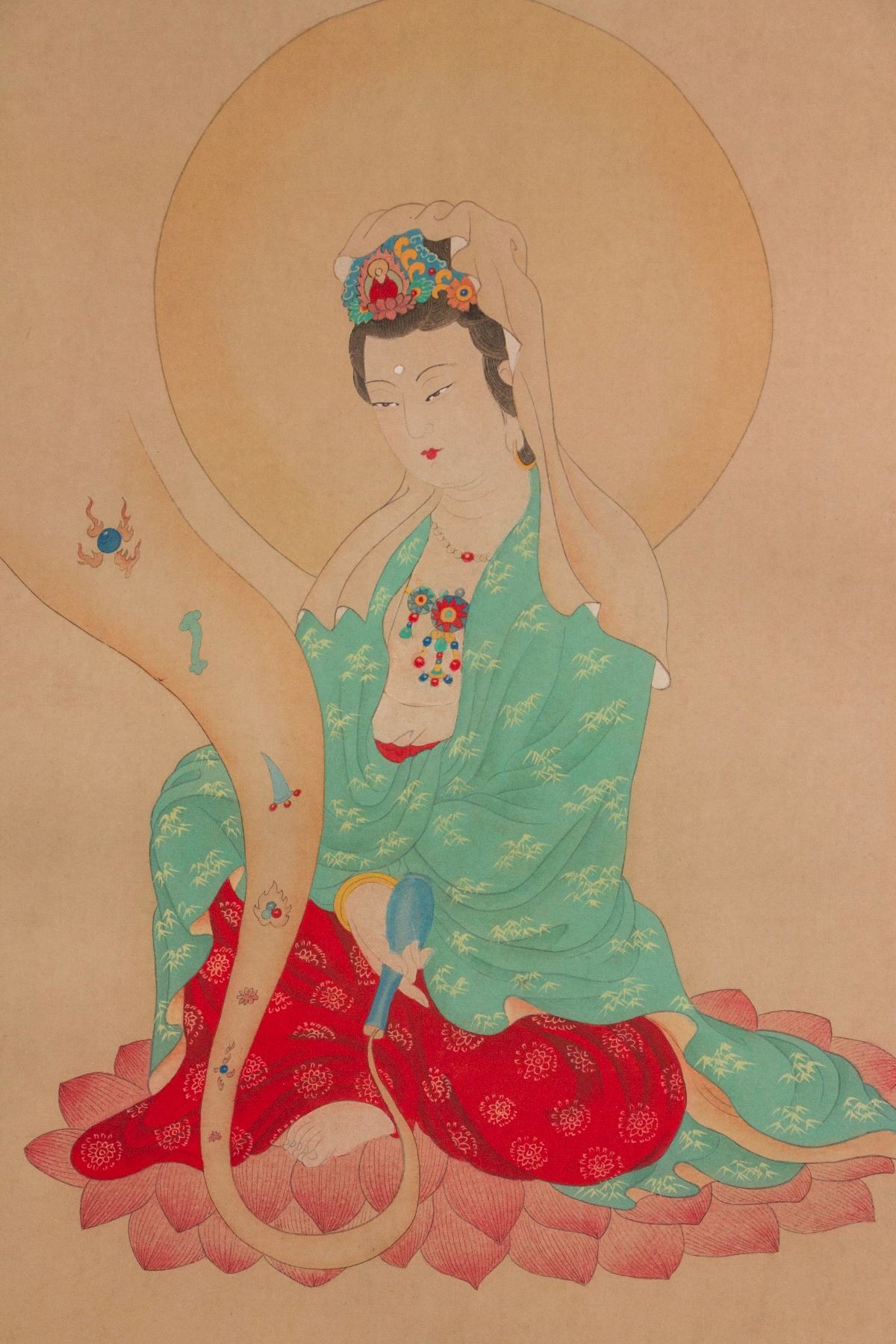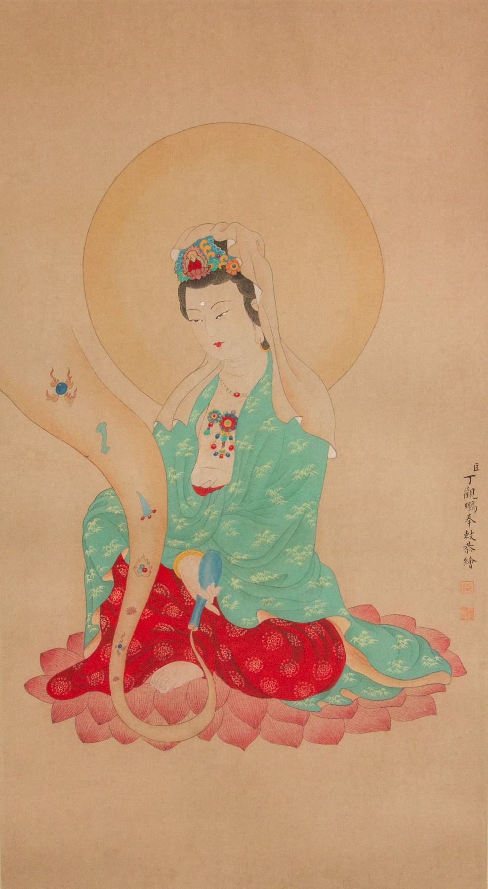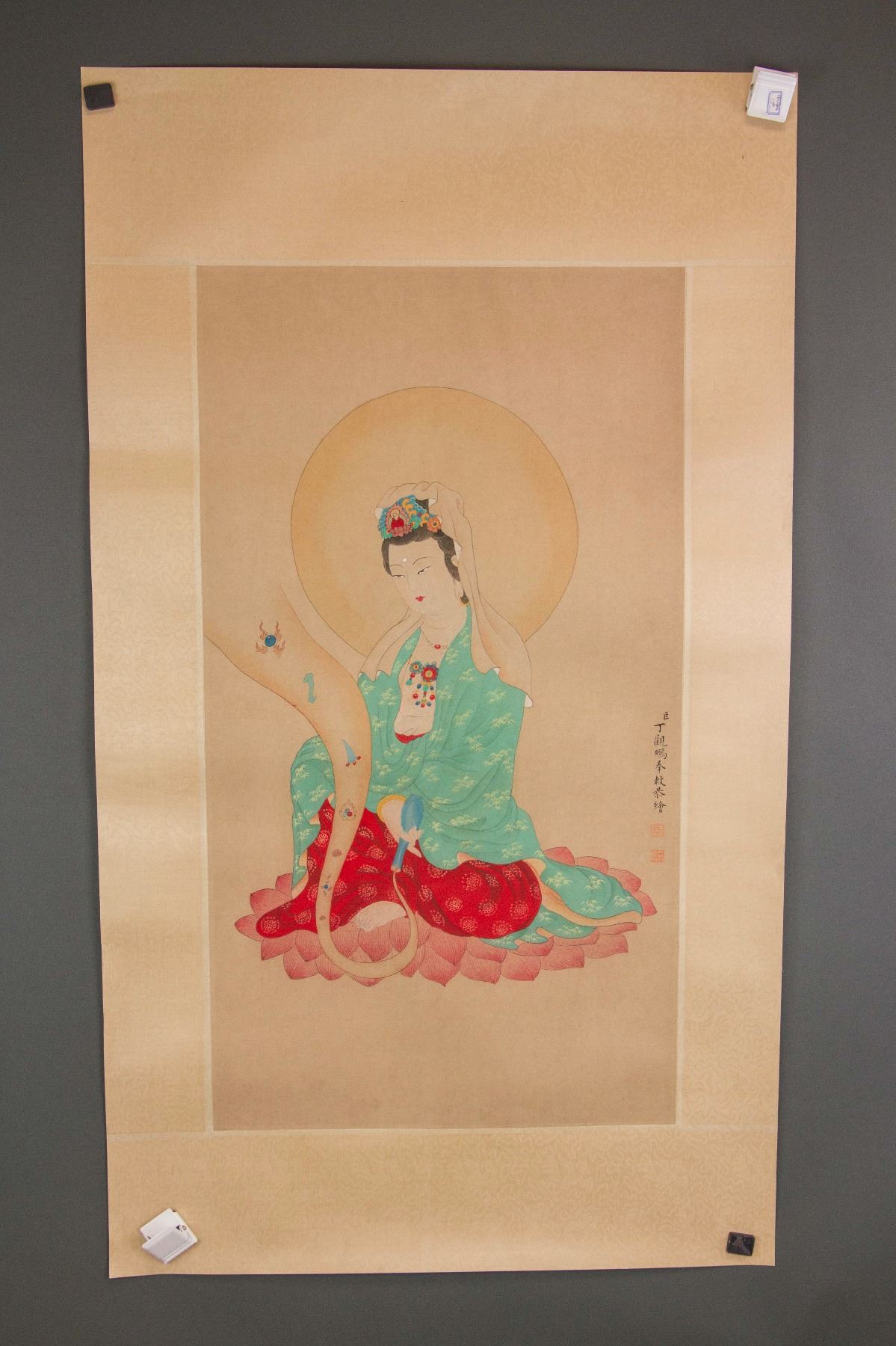 Painting of sitting Guanyin with vase; Chinese ink and watercolour on paper roll; signed Ding Guanpeng (1708-1771); inscribed with 2 artist seals; 79 cm x 44 cm