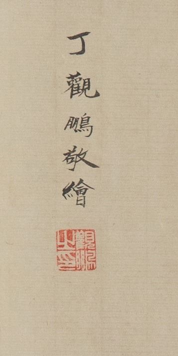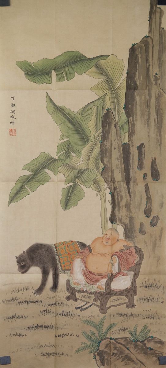 Laughing Buddha and a black bear under a banana tree; Chinese ink and watercolour on paper; signed Ding Guan Peng and inscribed with one artist seal; 93 cm x 40 cm