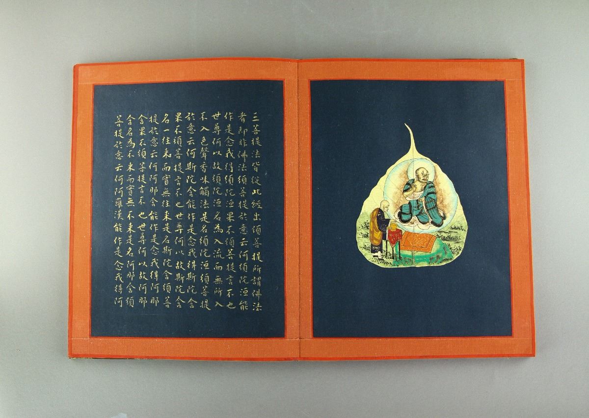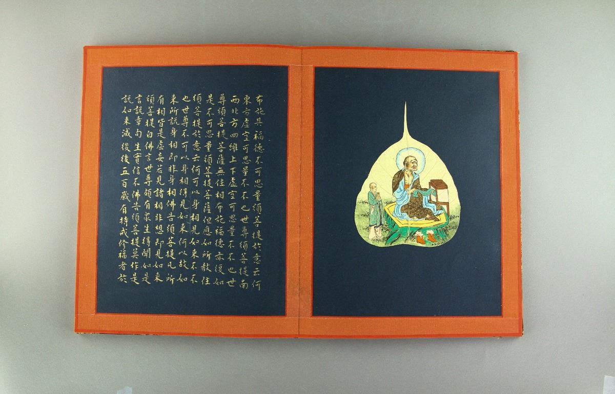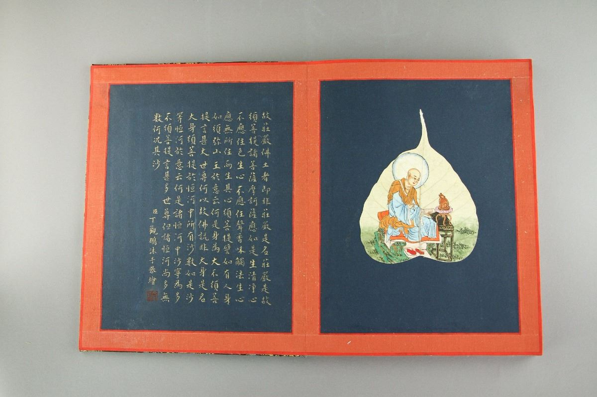 Arhat figures and Sutra script calligraphy; Chinese gilt ink and watercolour on paper; eight-page booklet; signed Ding Guanpeng and inscribed with one artist seal on the last page; 30 cm × 23 cm × 8 cm