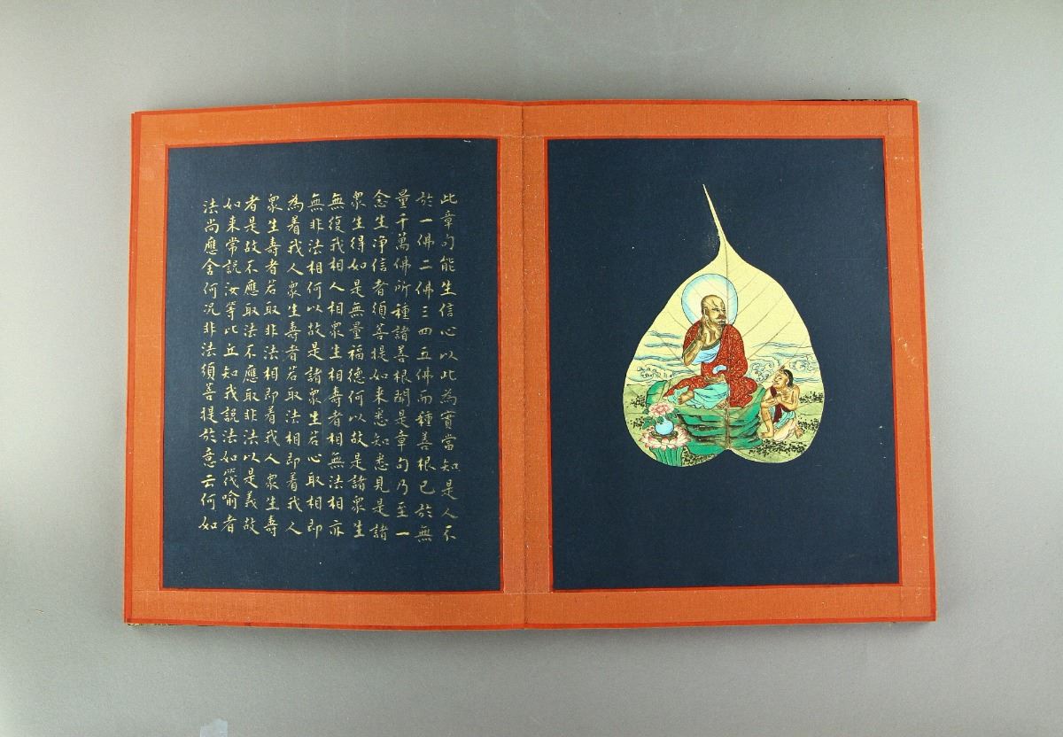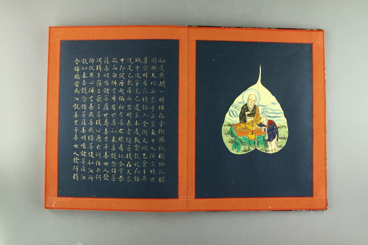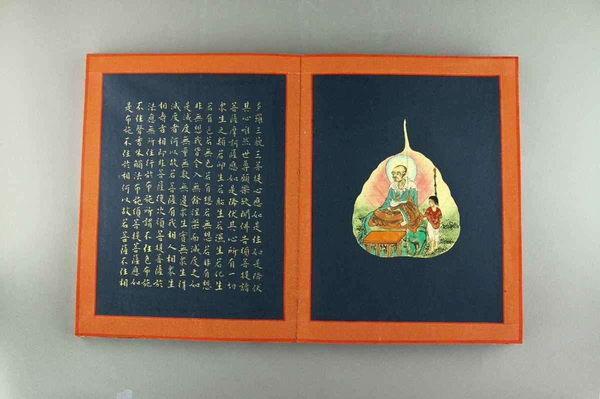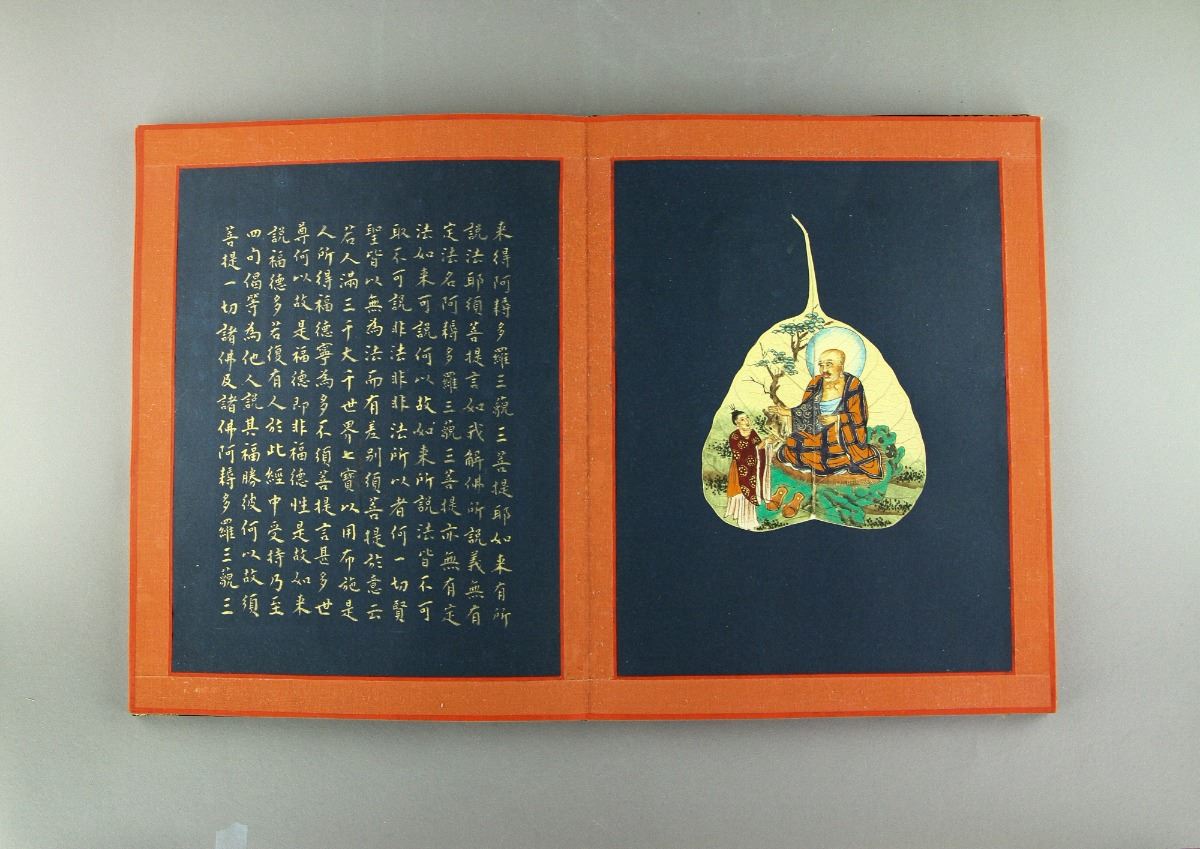 Arhat figures and Sutra script calligraphy; Chinese gilt ink and watercolour on paper; eight-page booklet; signed Ding Guanpeng and inscribed with one artist seal on the last page; 30 cm × 23 cm × 8 cm