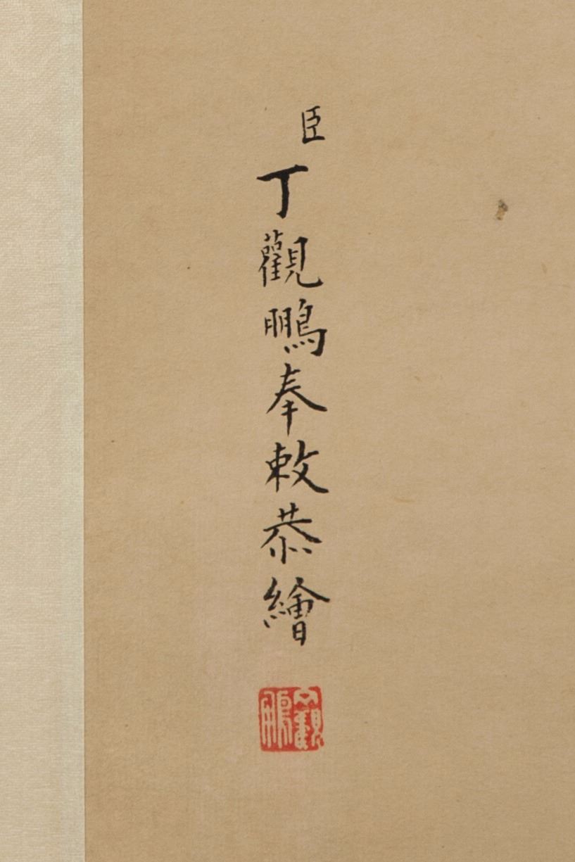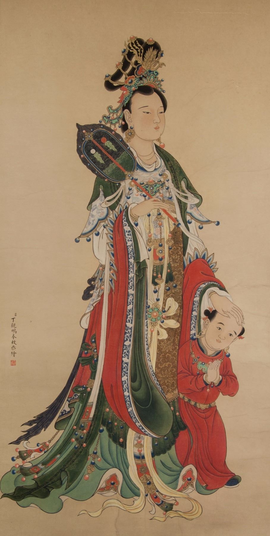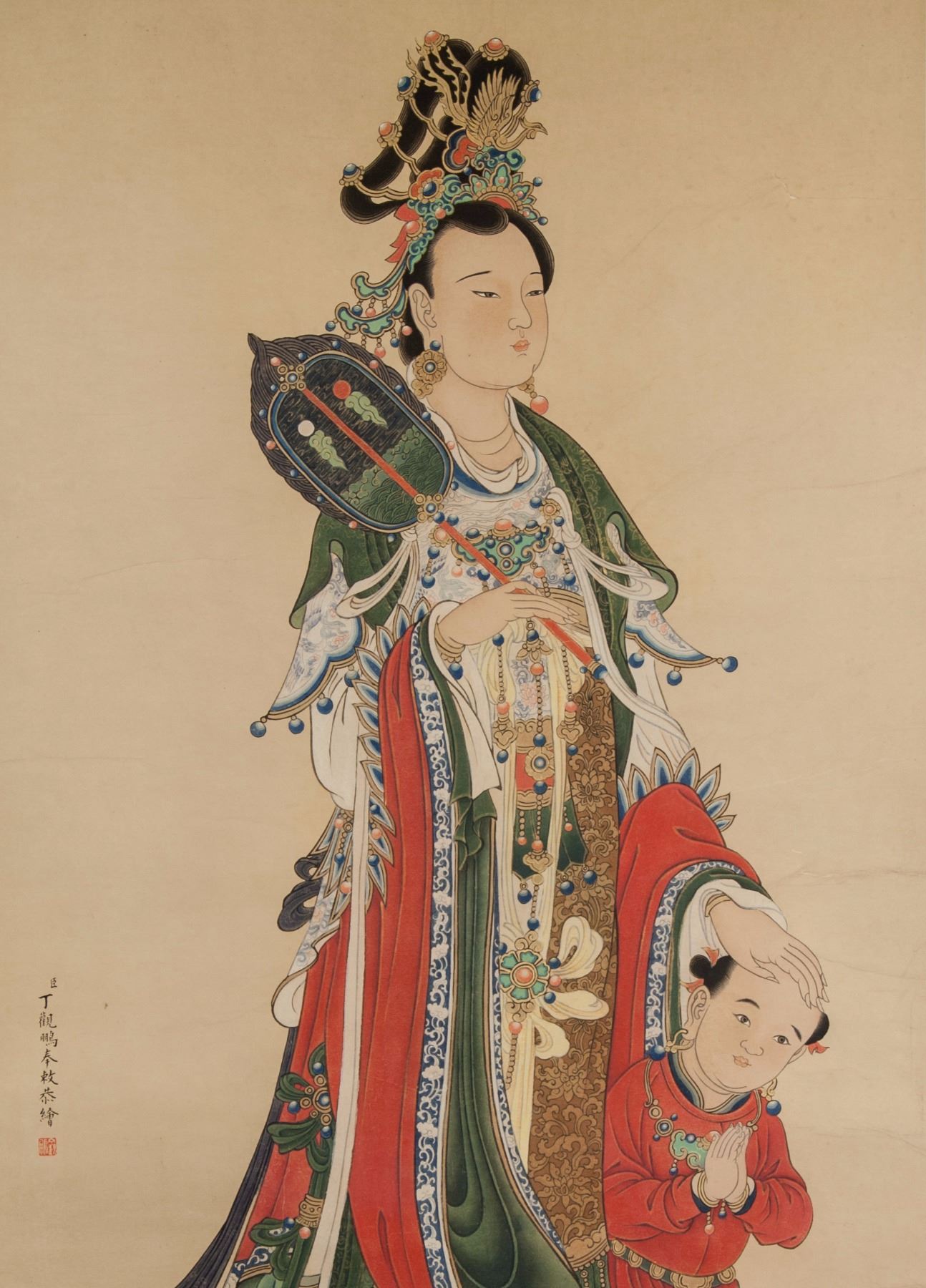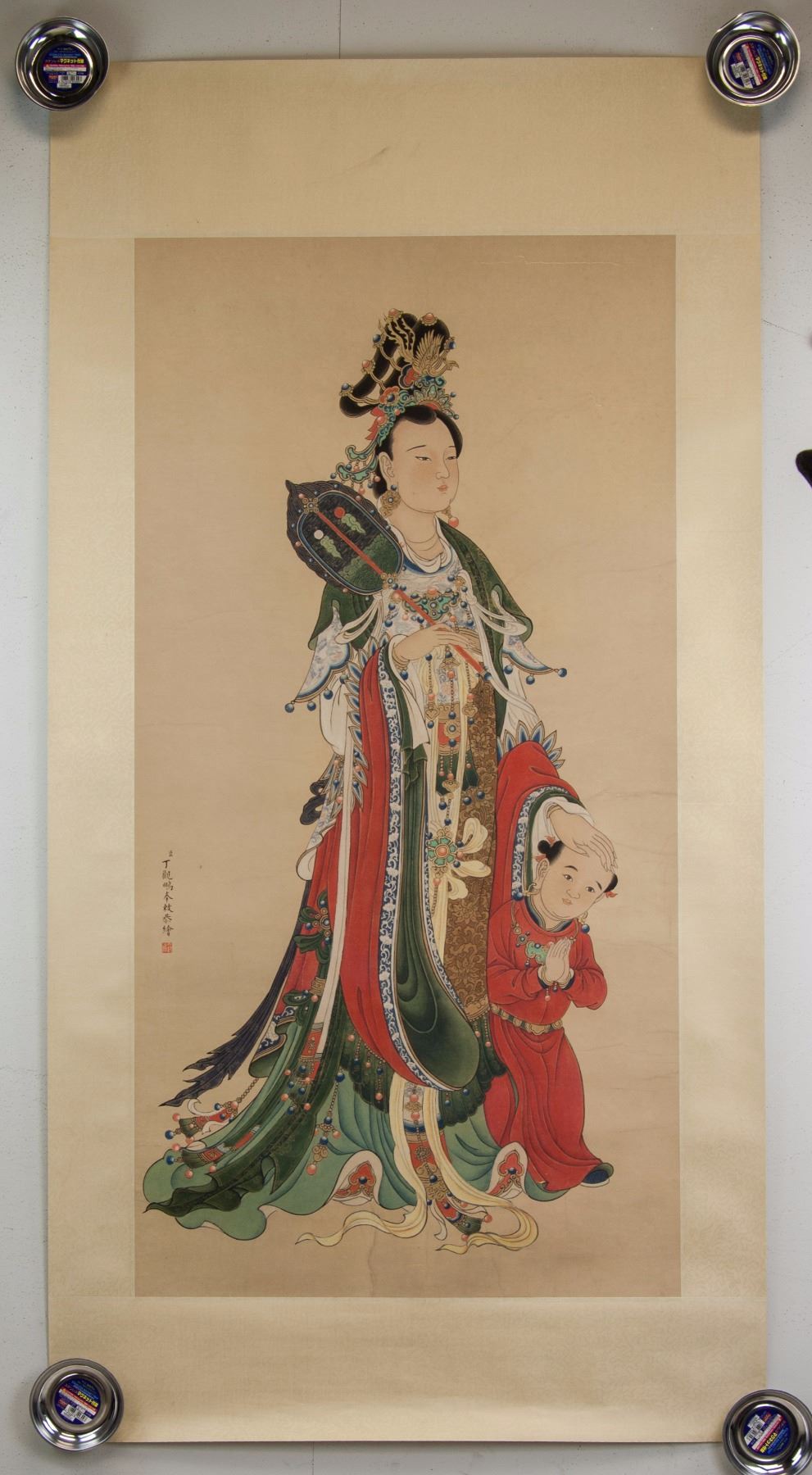 Painting of Guanyin and Shancai; Chinese ink and watercolour on paper roll; signed Ding Guanpeng (); inscribed with 1 artist seal; 123 cm x 62 cm
