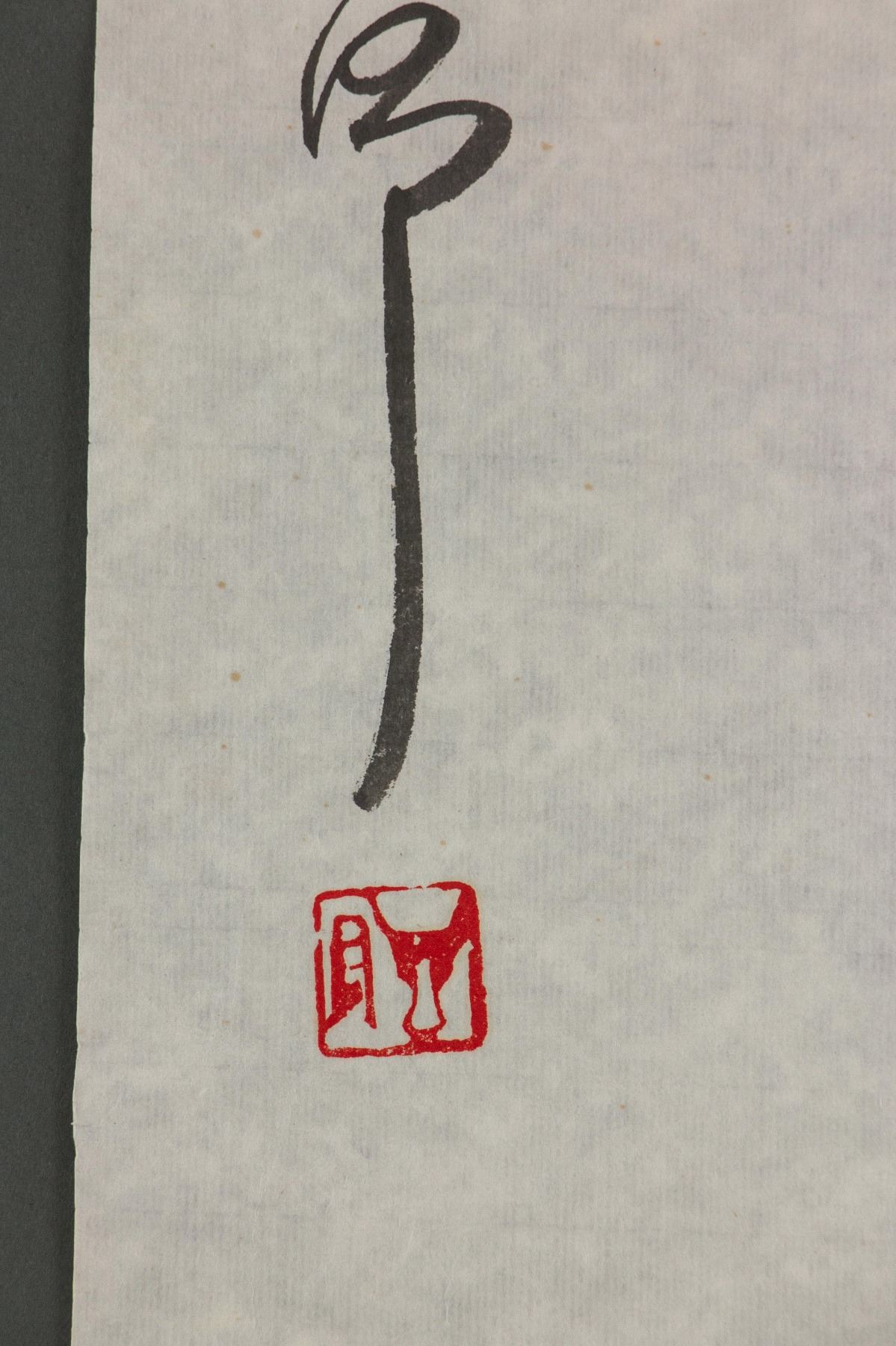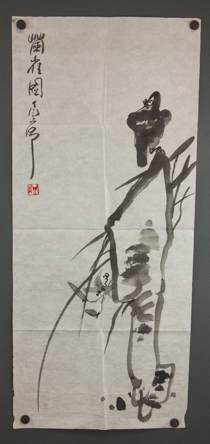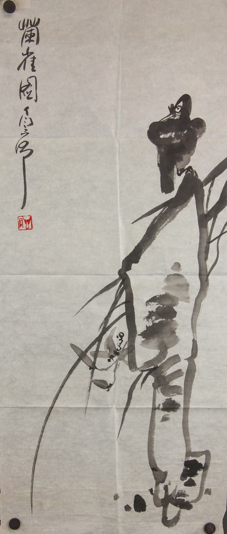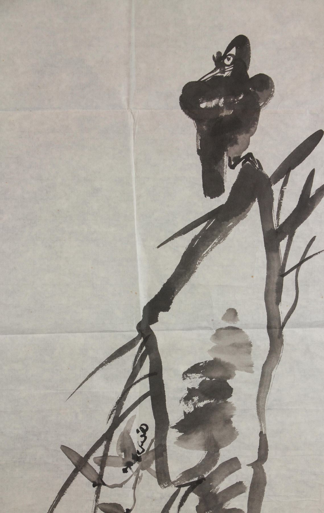 Painting of bird standing on rock; Chinese ink on paper; signed Ding Yanyong; inscribed with 1 artist seal;  89 cm x 40 cm