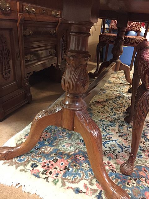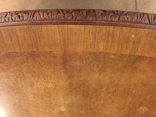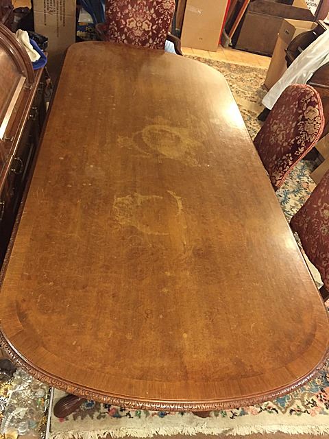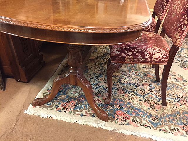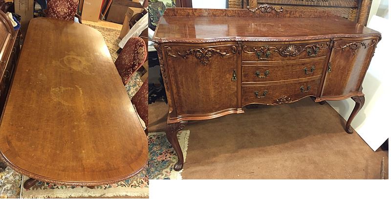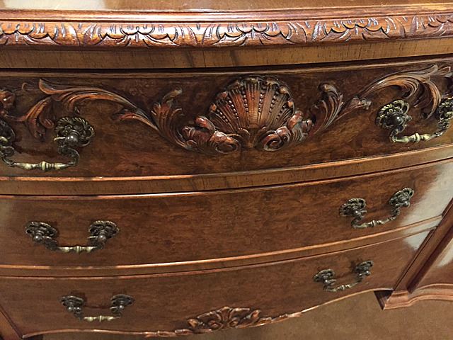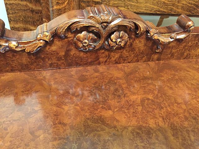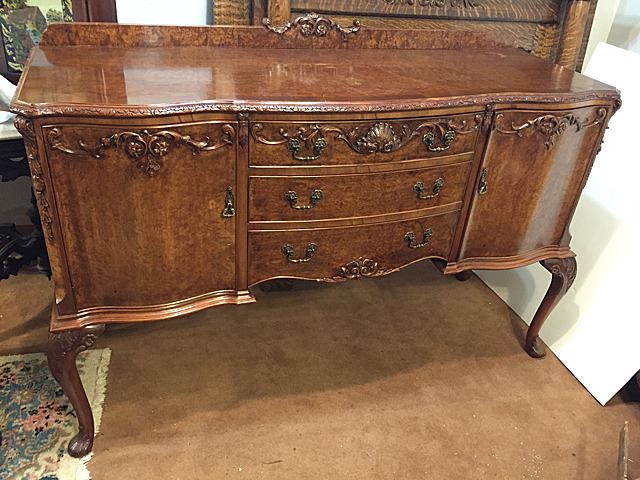 Beautiful burl walnut dining room set, very unusual sideboard with sea shell carvings. Oval table with double pedestal, carved edge, 6 matching chairs, all upholstered with beautiful fabric, carved legs, the set is in beautiful original condition and would retail between $2,000 to $3,000 in today's marketplace. A beautiful dining set, all ready to move in and enjoy your Holiday dining!