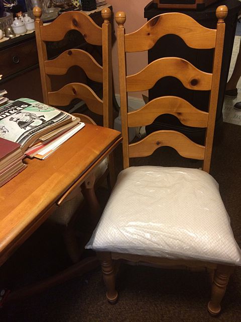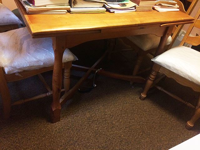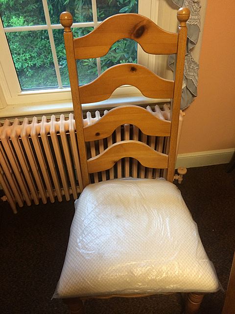 Estate oak dining room table with pull out leaves plus 6 matching ladder back dining chairs. All upholstery has been left in plastic and are in like new condition. Being sold as found at the estate. Local buyers take note: These items are at Litchfield, CT Estate and can be picked up at the estate.