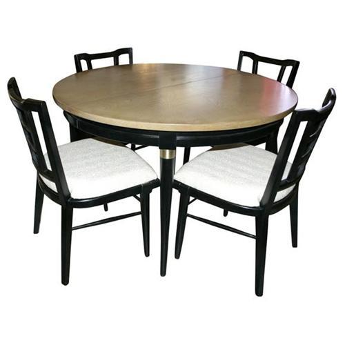 Dining table with 2 leaves and 4 chairs in the style of Harvey Probber. Flared legs and brass accents.