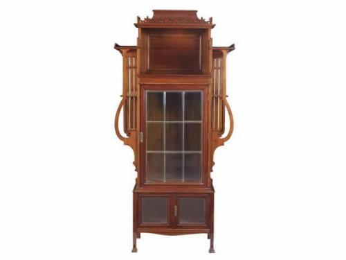 Mahogany veneered pinewood, brass decoration. Art Nouveau. Early 20th century. 190 x 96 x 41 cm
