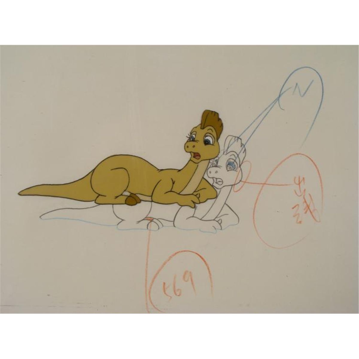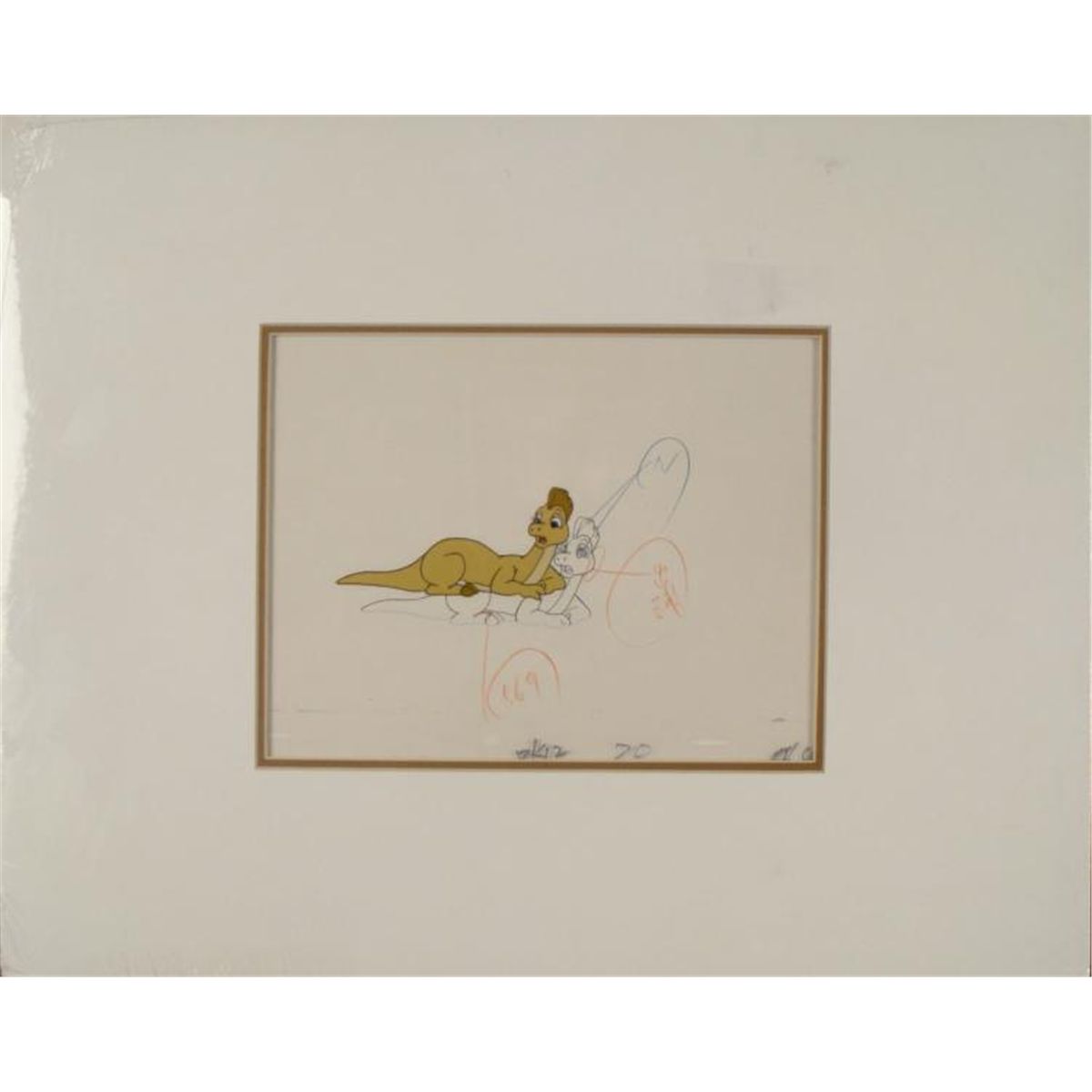 This is an original animation cel and matching drawing used in the production of the cartoon series Dink the Dinosaur. Shown here is a yellow dinosaur with somewhat surprised expression. * Medium: Hand-inked and hand-painted acetate cel; black pencil on animator's paper, with notations in blue and red pencilPresentation: Double matted in black and whiteImage size: 10 x 7 3/4 inchesMatte size: 20 x 16 inchesCondition: Excellent; sealed in cellophaneCertificate of Authenticity: Included