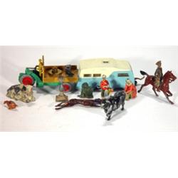 Dinky Toys four berth caravan, motocart and a selection of Britain's farmyard animals and soldiers
