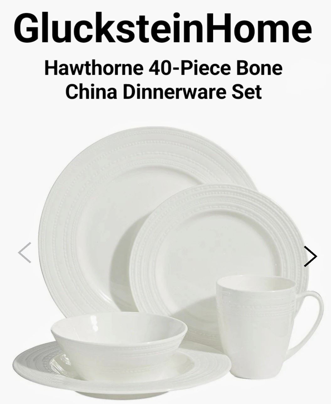 Hawthorne 40-piece bone China set, elegant white with detailed rim design, new.