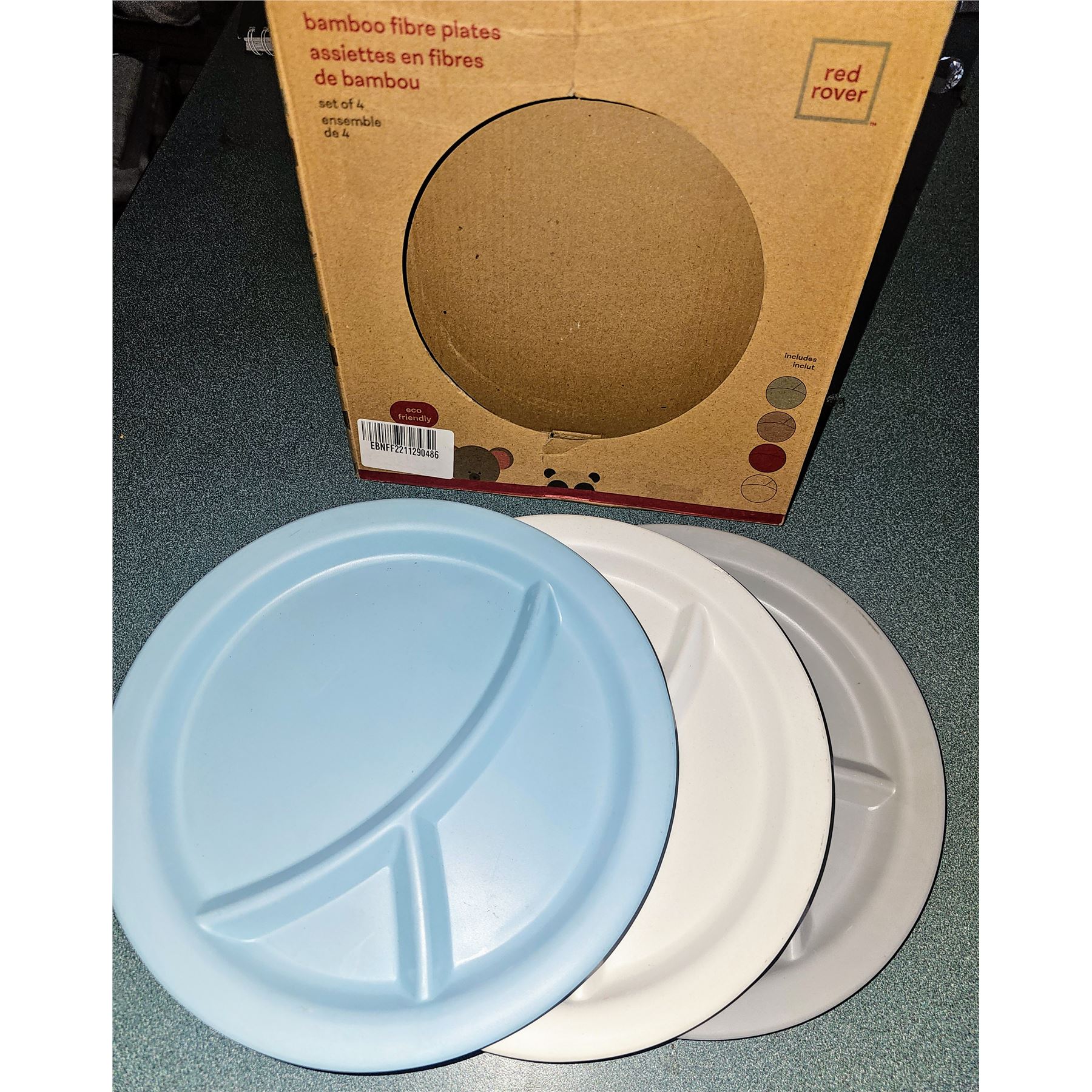 Set of 4 eco-friendly bamboo fiber plates in assorted colors, dishwasher safe, new.