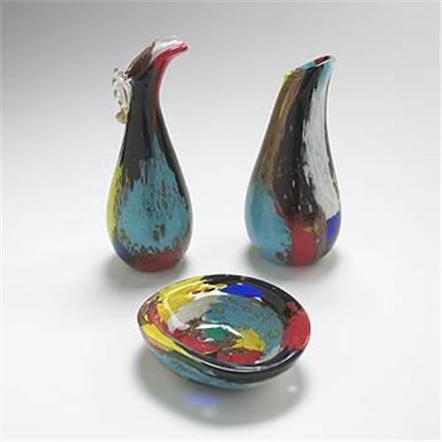 Dino Martens Oriente collection, set of three Aureliano Toso Italy, c. 1950 internally decorated glass vases: 3.25 dia x 9 h; 3.5 dia x 8 h bowl: 5.5 w x 4.5 d x 1.5 h