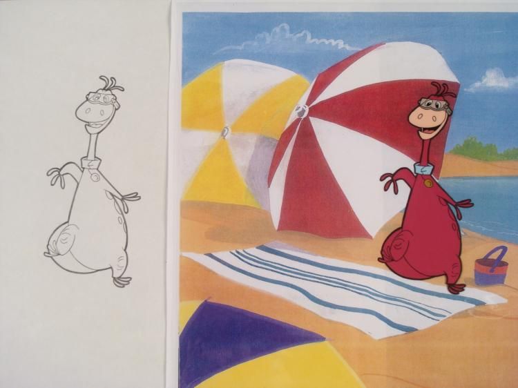 Depicted here, Dino appears to be waiting in anticipation for something good to happen. The cel comes with a matching drawing overlay. * * Original Production Art Cel, Drawing, and Reproduction Background Original "rough" animation drawing, with notations in black. Dino has been outlined in purple Overall Size of the Cel: 10 1/2" x 12 1/2" Overall Size of Reproduction Background: 11" x 13 1/4" * Excellent condition This is an original hand-painted cel set-up used in the production of an episode of "The Flintsones." Each one-of-a-kind set-up represents a slight change in position of the characters. When individually photographed and projected in rapid succession, the images appear to move. * To create production cels, the original animator's drawing is transferred onto an acetate cel (by hand-inking and/or photo copying). The cel is then hand-painted on the reverse side. The background accompanying this set-up is a reproduction background. * * The cel, drawing, and background are ready to be matted and framed. The animator's notations are shown at the bottom of the cel and drawing. *