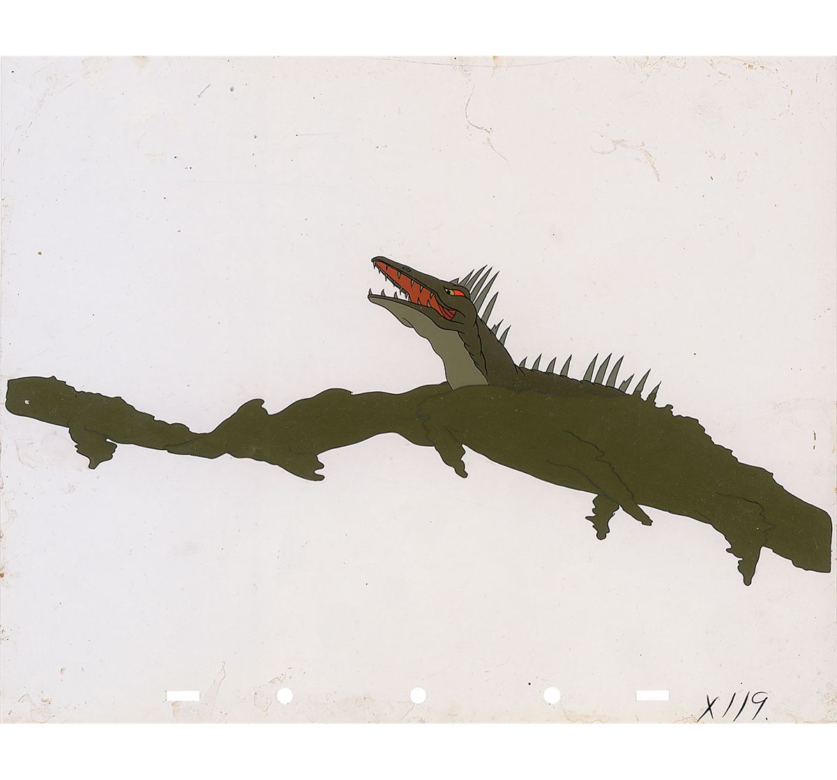 (Walt Disney Studios, 1940) Original production cel featuring a dinosaur from the ‘Rite of Spring’ sequence in Fantasia. The cel is slightly trimmed to 12.25 x 10. Image measures 12 x 4.75. Slightly trimmed edges and some scattered light soiling, otherwise fine condition.