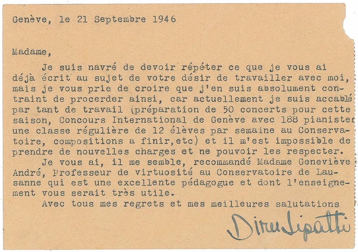 Romanian classical pianist and composer (1917–1950), who died of Hodgkin’s disease at the age of 33. Uncommon TLS in French, one page on the reverse of a 6 x 4 postcard, September 21, 1946. Letter to Madame P. Reichel, in which the famed pianist sends his regrets for being unable to assist her due to a demanding work schedule that includes an upcoming season of 50 concerts, the International de Geneve competition with 188 pianists, a regular class of 12 pianists to teach at the Conservatoire, compositions to finish, and so on. In fine condition, with minor paper loss to the upper right corner. Accompanied by an unsigned photo.