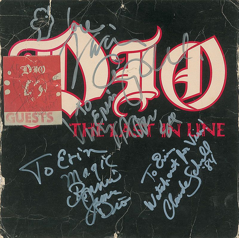 The Last in Line album flat signed and inscribed on the front cover in silver ink by Ronnie James Dio, Vinny Appice, Claude Schnell, and Vivian Campbell. In very good condition, with scattered noticeable creasing and a guest pass affixed to left edge, signed and inscribed in an unknown hand. Accompanied by a Starange Highways World Tour 93–94 guest pass.