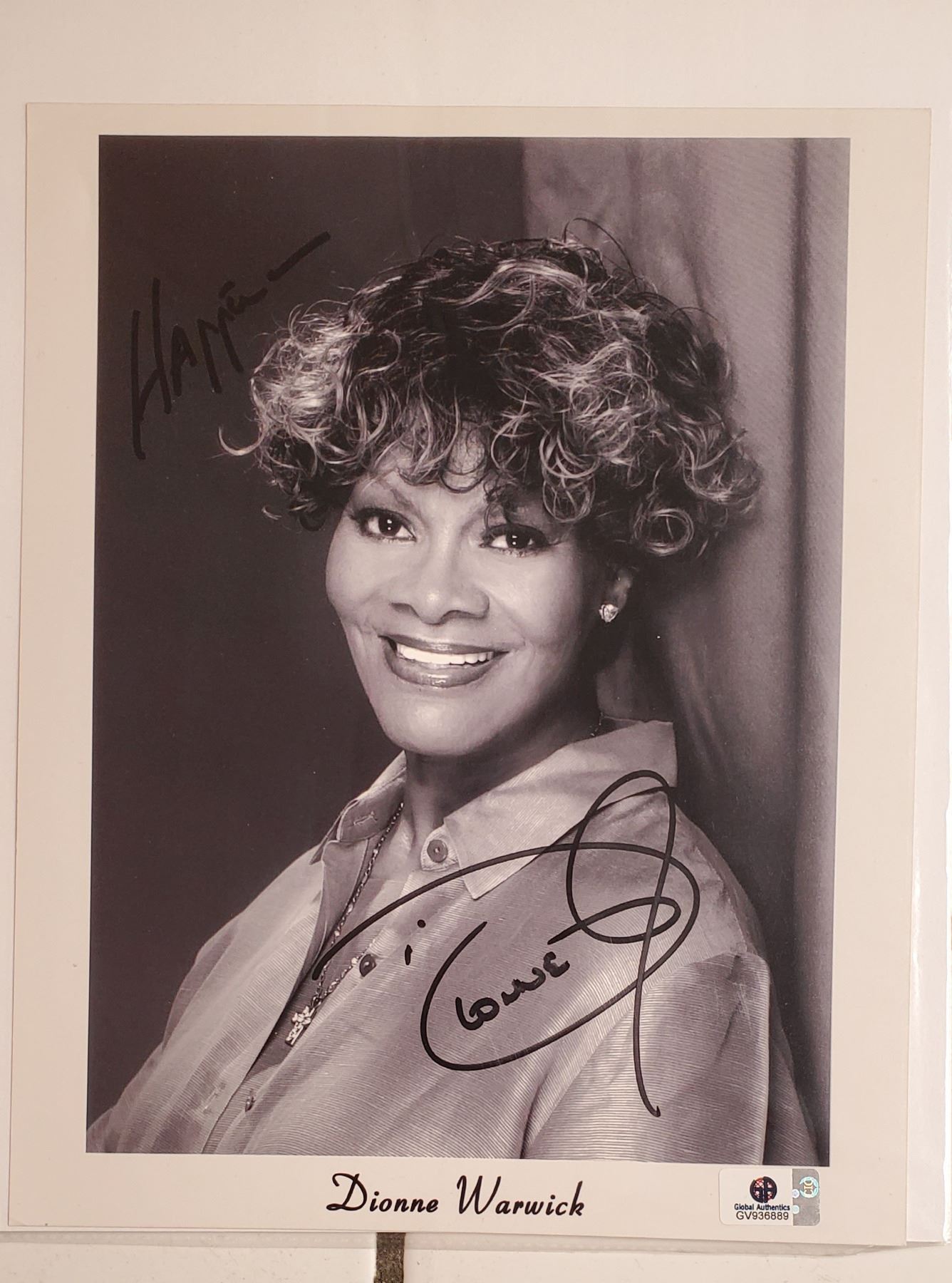 An 8” x 10” photograph signed by Dionne Warwick. Global Authentics authenticated the autograph, providing a COA numbered GV 936889.