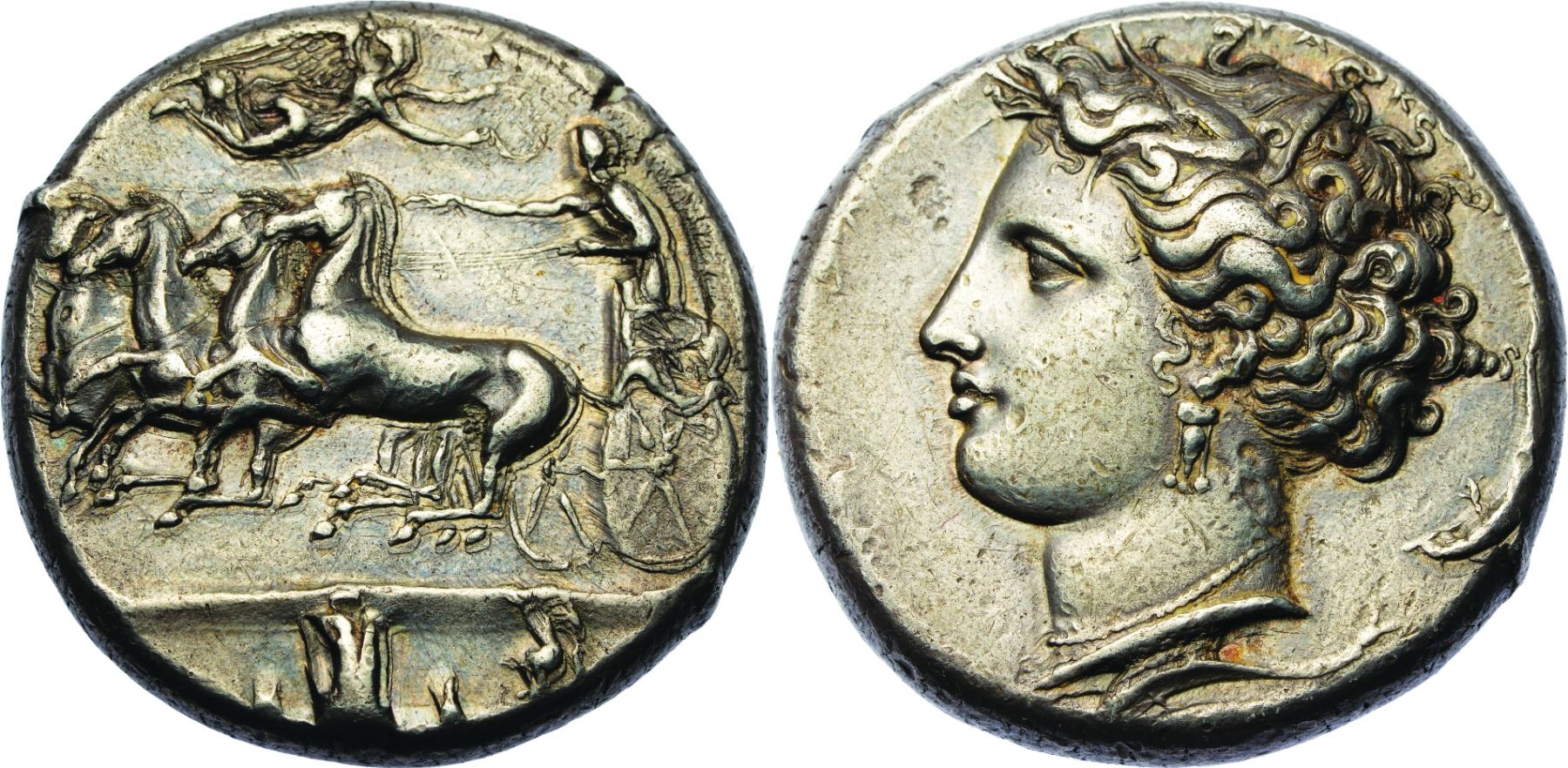 Dionysios I. 405-367 avant J.C. Décadrachme, Syracuse, AG 43.2 g. Avers : Quadrige à gauche condu