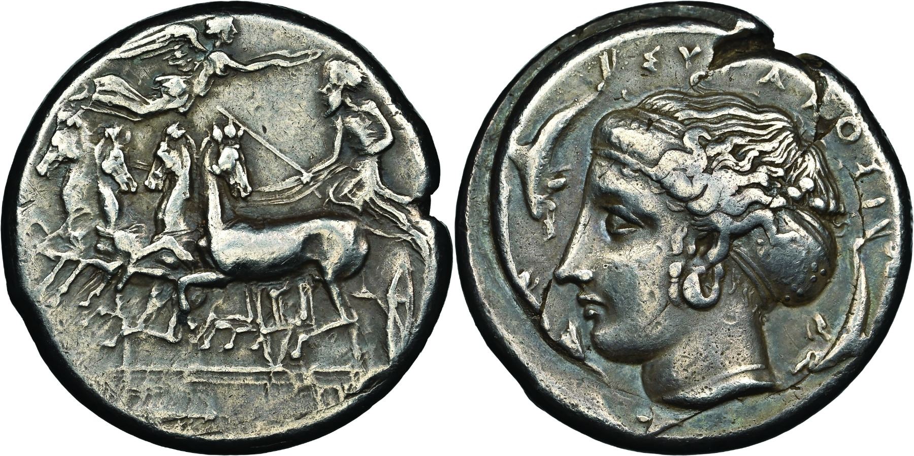 Revers : Tête d’Aréthuse à gauche, les cheveux dans un sphendone orné, portant une grande boucle d'oreille et un collier linéaire avec un petit pendentif frontal; quatre dauphins nageant autour. Ref : FischerBossert, Coins (Tudeer) 82 (V30/R55), SNG ANS 290 ; BMC 217–8 , Dewing 849, de Luynes 1218 , Gillet 658, McClean 2718, J. Hirsch XXXII (Virzi), lot 339 (tous des mêmes coins) , HGC 2, 1342.