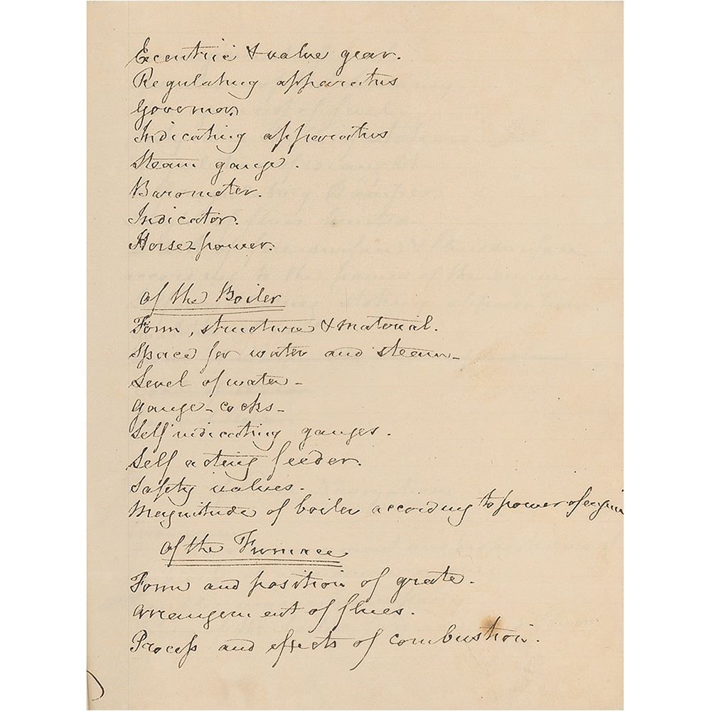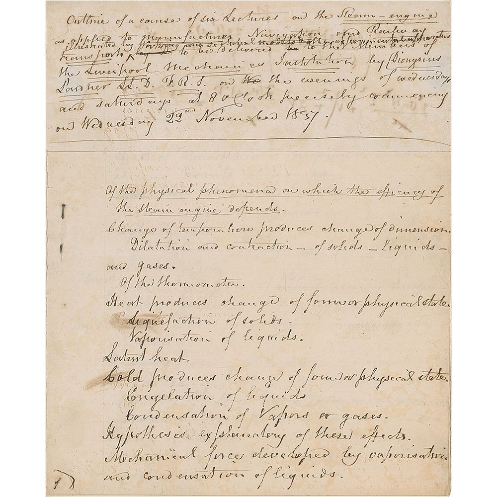 Handwritten syllabus for a course of lectures by Lardner, eleven pages, 7.25 x 9, signed in the third-person within the heading: "Outline of a course of Six Lectures on the Steam-engine as applied to Manufactures, Navigation and Railway transport, illustrated by working…models and other experimental apparatus. To be delivered to the Members of the Liverpool Mechanics Institution by Dionysius Lardner LL.D., F.R.S. on the evenings of Wednesdays and Saturdays at 8 o'clock precisely commencing on Wednesday 22nd November 1837." The manuscript presents a detailed listing of the topics to be covered in his lectures, ranging from the creation of steam, to the workings of pistons within the engine, to areas that could be serviced by railways and locomotives. In fine condition.