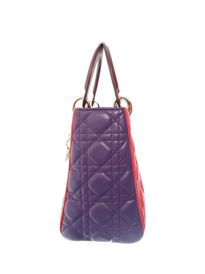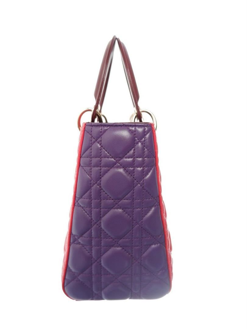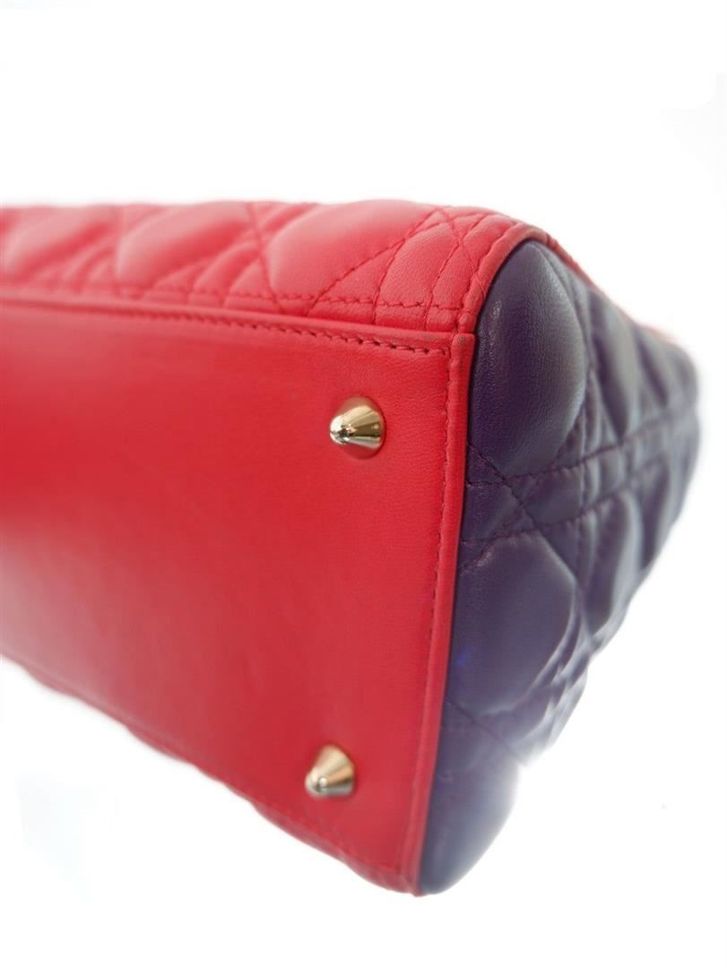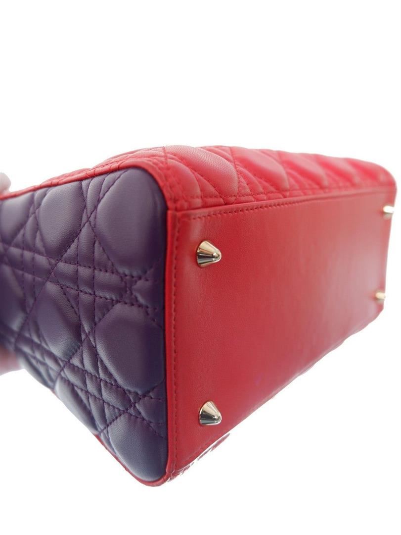 Red and purple quilted pattern embroided lambskin leather Christian Dior multicolor Cannage medium tote bag features leather and dangling Dior letter charms comes with silver-tone hardware, double flat leather top handles and a removable long leather shou