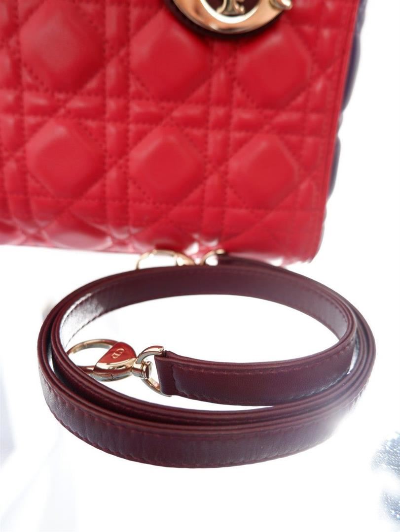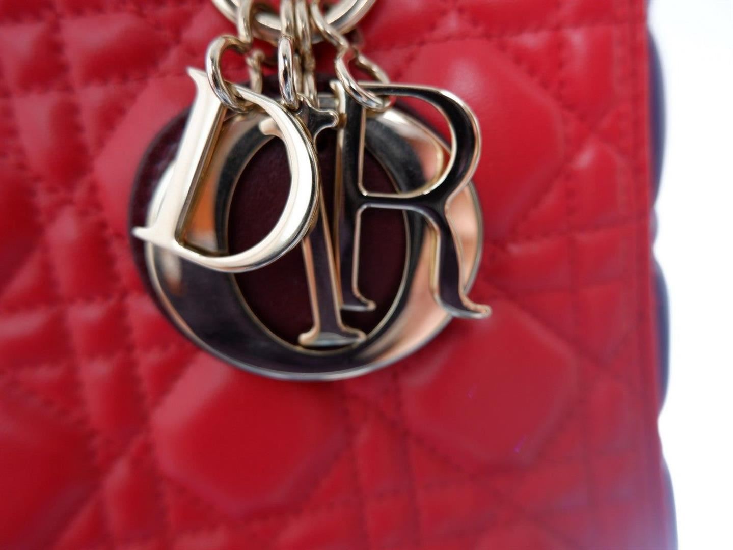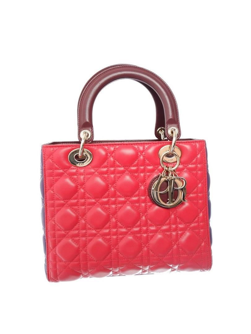 Red and purple quilted pattern embroided lambskin leather Christian Dior multicolor Cannage medium tote bag features leather and dangling Dior letter charms comes with silver-tone hardware, double flat leather top handles and a removable long leather shou