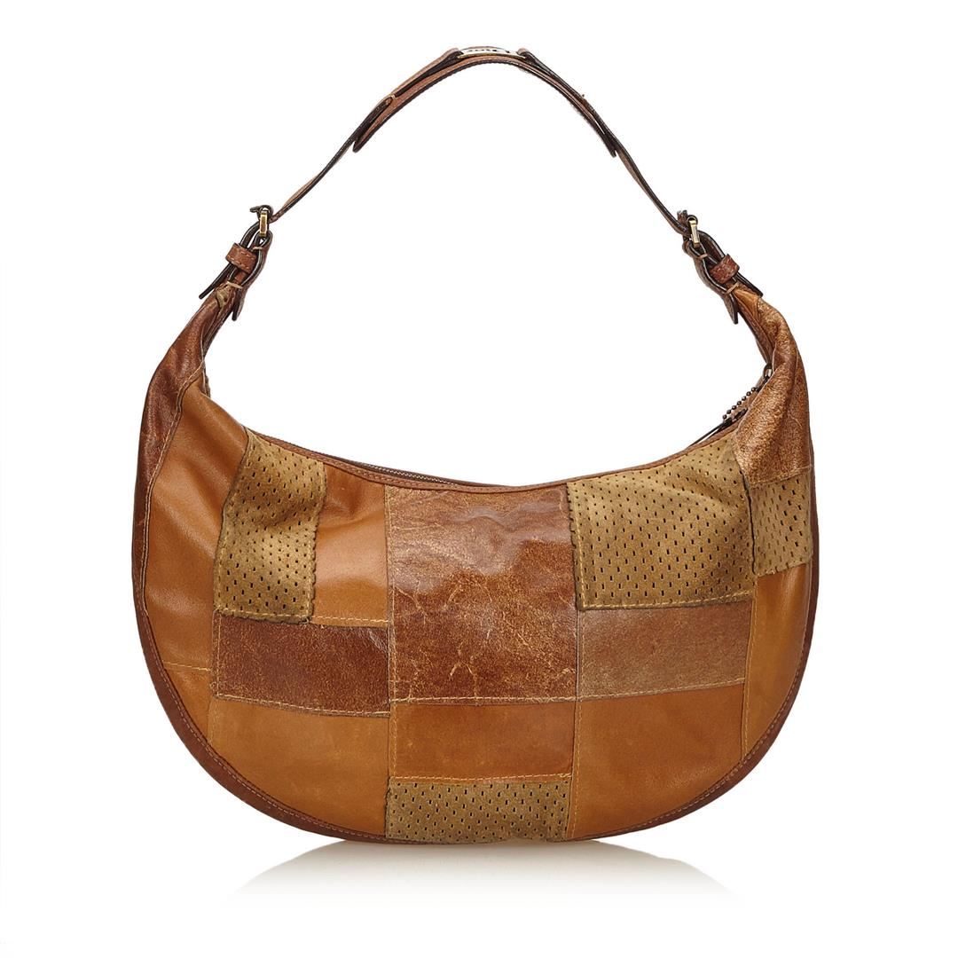 One Dior Patchwork Leather Shoulder Bag. This shoulder bag features leather patchwork body, flat leather strap, top zip closure, and interior zip pocket.