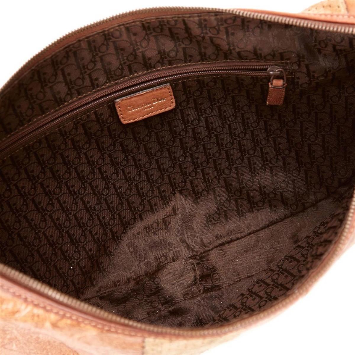 One Dior Patchwork Leather Shoulder Bag. This shoulder bag features leather patchwork body, flat leather strap, top zip closure, and interior zip pocket.