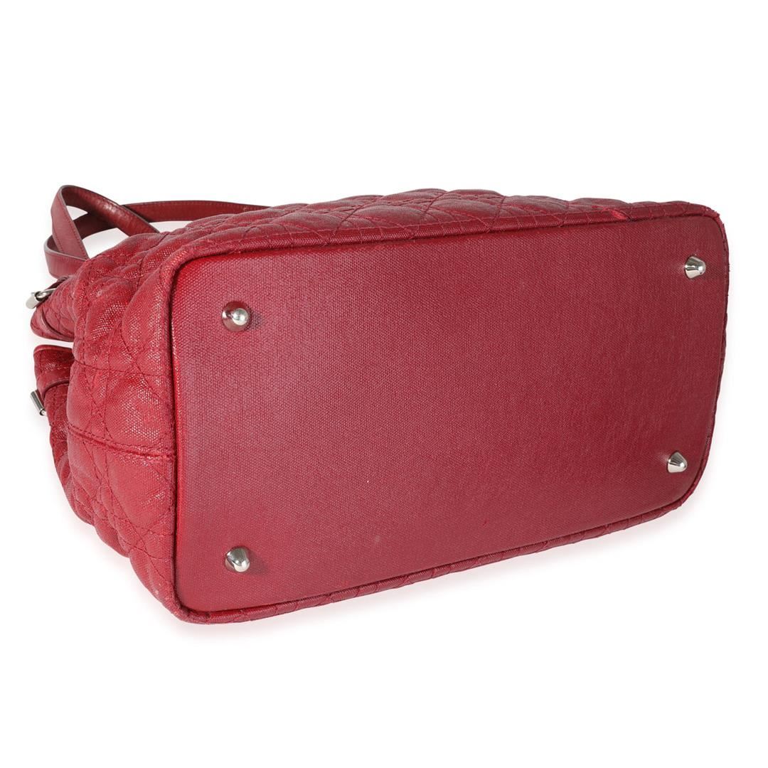 One Dior Red Cannage Coated Canvas Panarea Tote. Item is sold AS-IS. All available information is listed in the description and shown in the photo. Dior Red Cannage Coated Canvas Panarea Tote. Features silver hardware, red leather straps, red canvas interior with a zipper pocket, and a button closure.