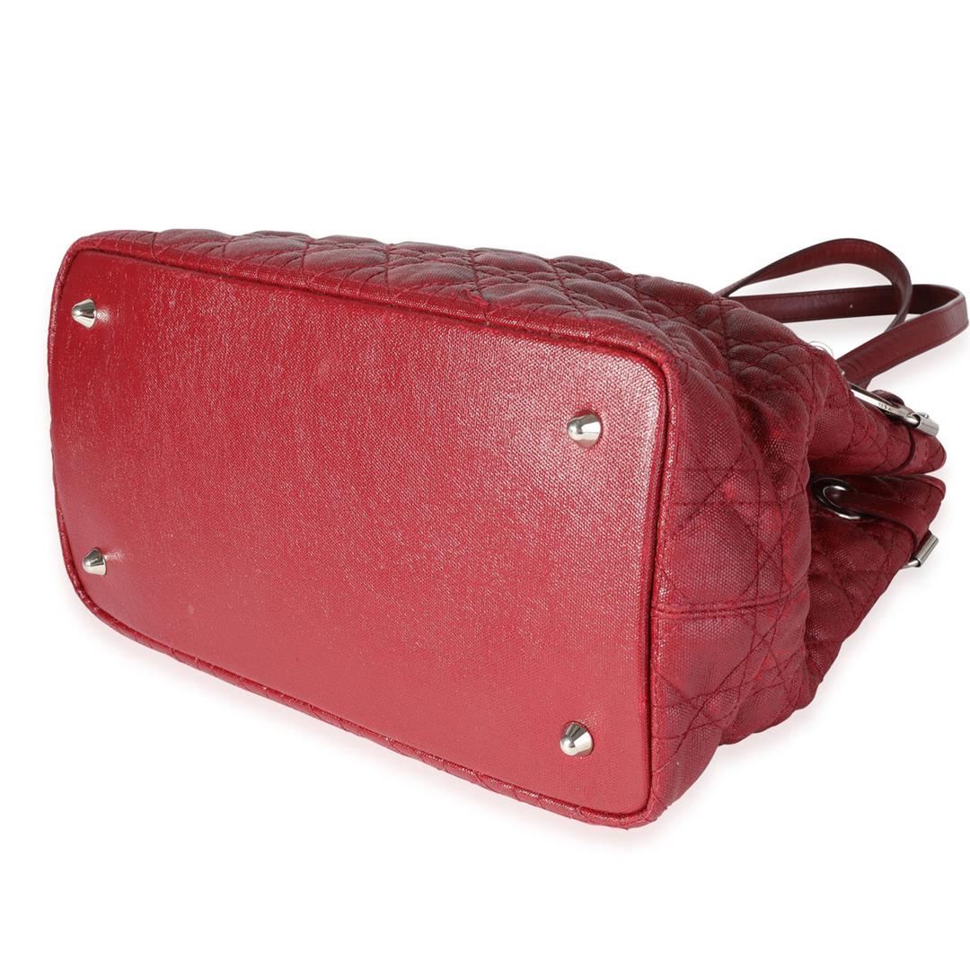 One Dior Red Cannage Coated Canvas Panarea Tote. Item is sold AS-IS. All available information is listed in the description and shown in the photo. Dior Red Cannage Coated Canvas Panarea Tote. Features silver hardware, red leather straps, red canvas interior with a zipper pocket, and a button closure.
