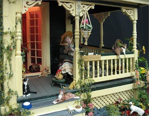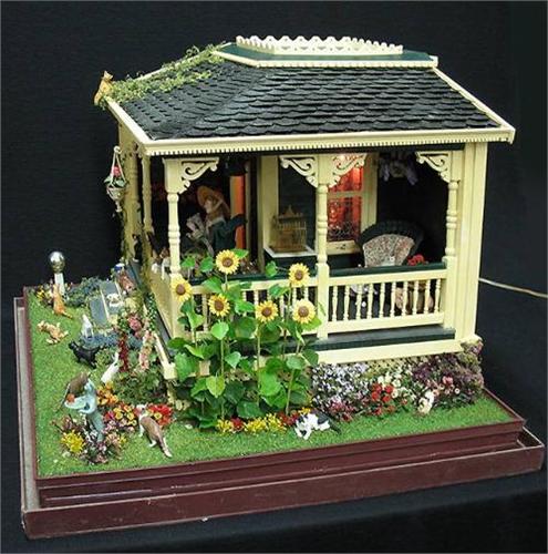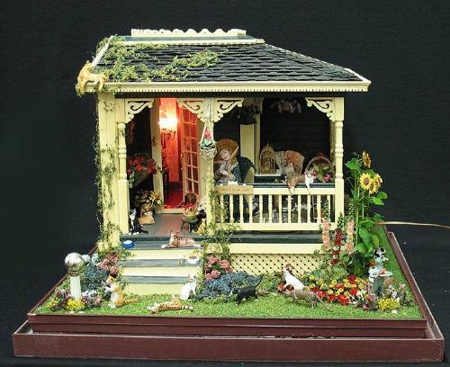 Diorama - House depicting front porch and lawn; woman on rocker on front porch and cats in yard and on porch; electrified; lighted candelabra lamp; opens in back to expose interior of house; created by Phyllis Sturbakov; late 20th C.; 14 1/2" high x 18 1/2" x 19 1/2" (no visible defects) Will Not Ship