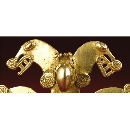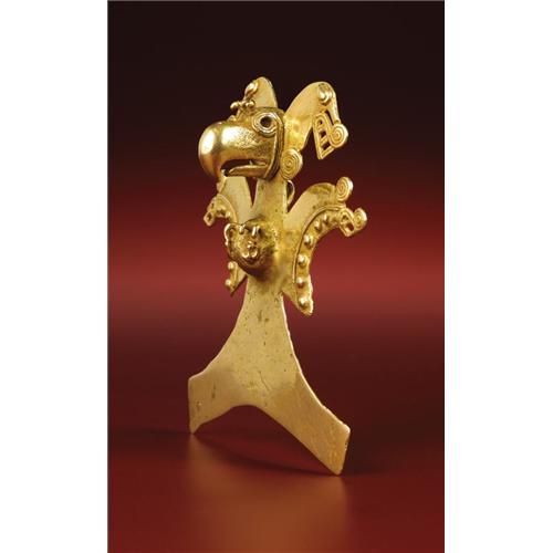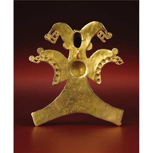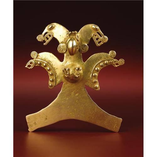 <B>Bird-form Pendant</B></I><BR>Diquís Delta<BR>A.D. 700 - 1500<BR>Gold, Weight 135.45 grams<BR>Height 4 ½ in. Width 4 3/32 in.<BR><BR>Bold, lively profile crocodile heads arch at either side above the massively-beaked bird whose spiky crest may indicate that it is a harpy eagle, the largest and most powerful New World raptor. The heavy, broad beak and chin strap around the eye are characteristics of the Jalaca region style. The talon treatment, with its suggestion of front and rear opposition, is unusual. The beaded wings are given a further powerful enhancement by small, profile crocodile heads at their tips. There is a crack in the proper left tail, with the condition otherwise good.<BR><BR>The lot is sold with a statement of authenticity from the distinguished expert Robert Sonin.<BR><BR>Provenance<BR>Charles Craig, Santa Barbara<BR><BR>