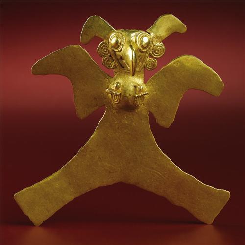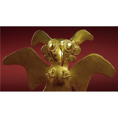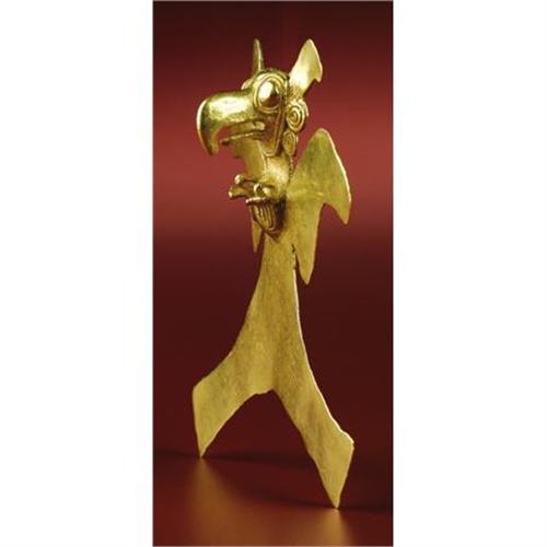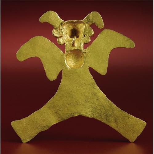 <B>Avian Pendant with Wing-Style Ears</B></I><BR>Diquís<BR>A.D. 700 - 1520<BR>Gold, Weight 69.1 grams<BR>Height 3 7/8 in. Width 3 7/8 in.<BR><BR>This bird-formed pendant embodies several characteristics of the Jalaca type, including double ear whorls and chin bands under a prominent hooked beak. Bulging circular eyes are also banded for emphasis. The bird represented may be a harpy eagle. Flat flanges represent the wings, exaggerated bifurcated tail, and head tufts. The talons jut out from the chest ready to carry off its prey. At contact period indigenous people of the area believed that harpy eagles carried the souls of the dead to the nether world.<BR><BR>Provenance<BR>Charles Craig, Santa Barbara<BR><BR>