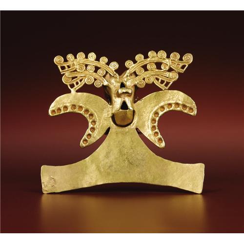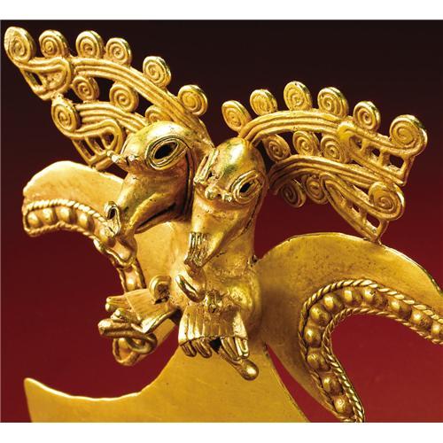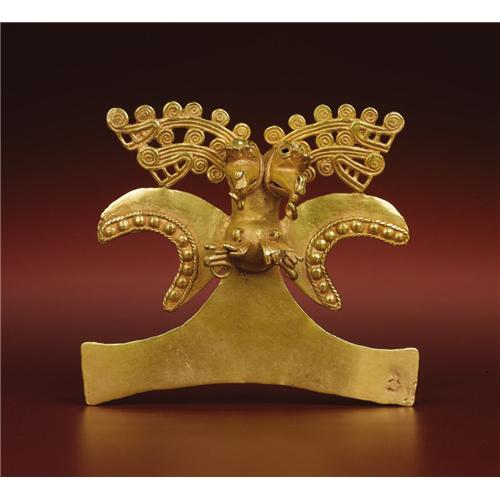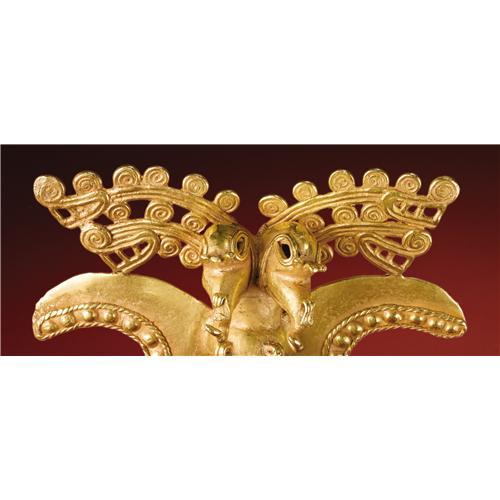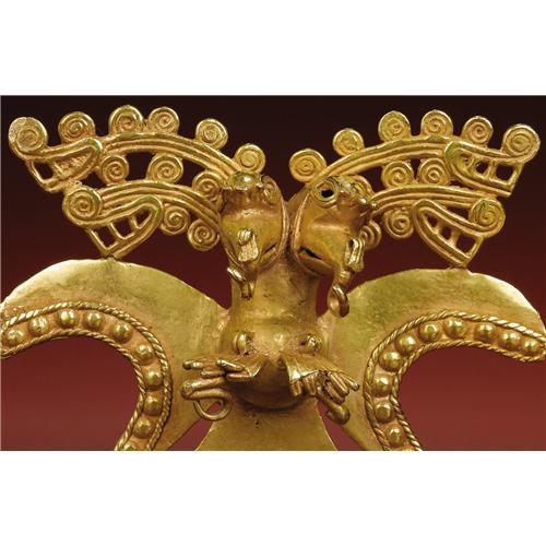 <B>Double-headed Bird-form Pendant</B></I><BR>Diquís<BR>A.D. 700 - 1500<BR>Gold, Weight 178.57 grams<BR>Height 4 1/16 in. Width 4 7/16 in.<BR><BR>This richly elaborated pendant has not only double, crested bird heads, but two-tiered profile crocodile heads extending to the sides from behind the bird heads, their necks emanating sequences of curls. Great visual dynamism results. The braiding which surrounds the bosses along the lower wing edges supplements the energy of the composition. Suspension hooks were cast from the beak tips and ends of the talons, but there is no evidence that danglers were ever provided. The pendant was ritually "killed", fortunately not with great severity, but still enough to crack and bend the talons and blunt the curls at the upper beak tips and the beak-end suspension hooks. This process also flattened the back suspension loop. An ancient patch was integrated into the proper left tail end by hammering. The condition is good.<BR><BR>The lot is sold with a statement of authenticity from the distinguished expert Robert Sonin.<BR><BR>Provenance<BR>Charles Craig, Santa Barbara<BR><BR>