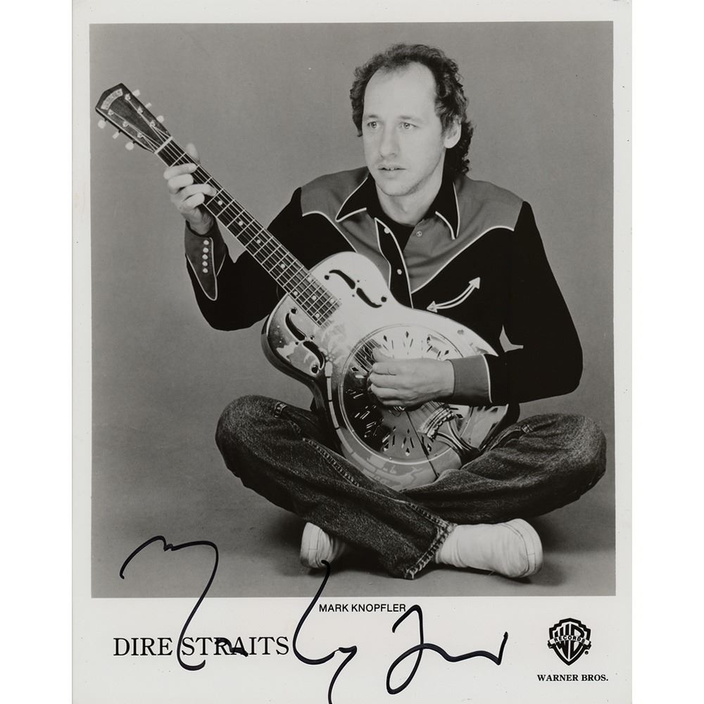 Glossy 8 x 10 Warner Bros. publicity photo of Dire Straits frontman Mark Knopfler seated with his National Style 'O' guitar, signed in black felt tip. In fine condition, with scattered small surface creases. Originally obtained by in-person specialist Mike Wehrmann.