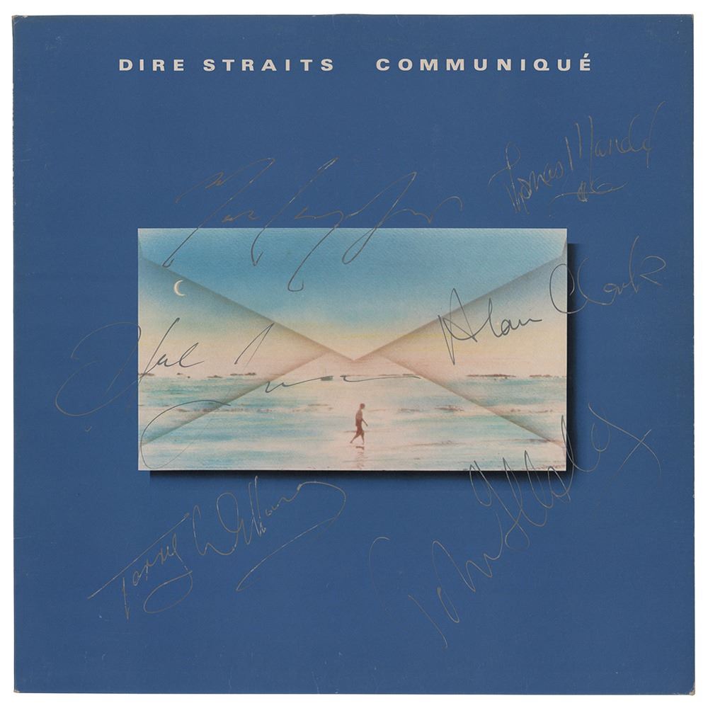 Communique album by Dire Straits, signed on the front cover in silver ink by Mark Knopfler, John Illsley, Alan Clark, Hal Lindes, Tommy Mandel, and Terry Williams. In fine condition. The record is included.