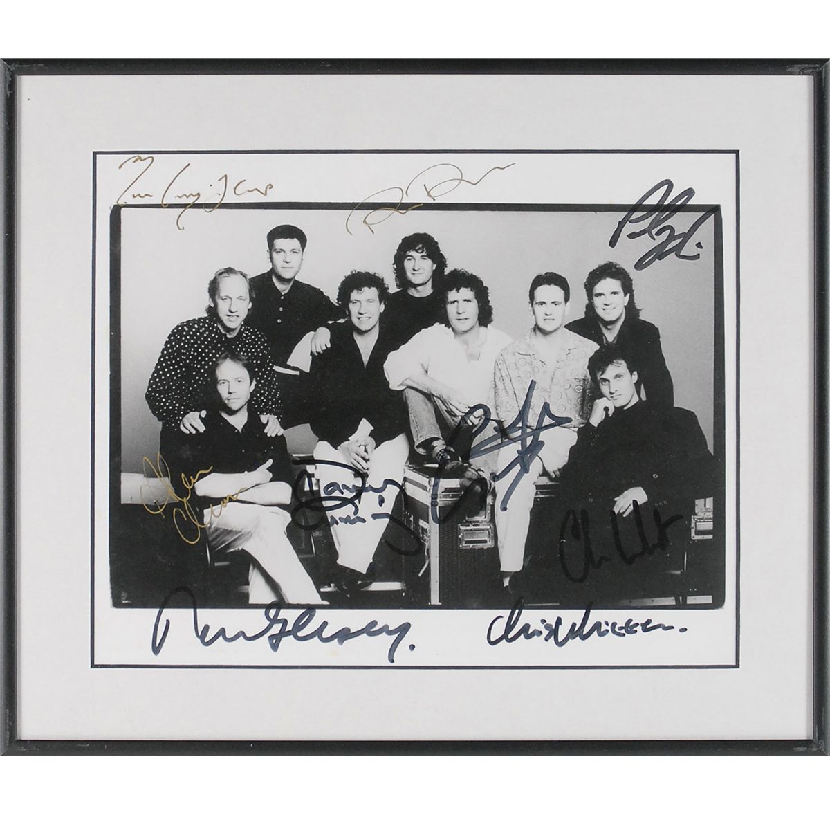 Fully signed matte-finish 9.75 x 7.75 publicity photo of the whole band circa 1991, signed in gold ink and black felt tip by Mark Knopfler, John Illsley, Alan Clark, Guy Fletcher, Phil Palmer, Chris White, Danny Cummings, Paul Franklin and Chris Whitten. Matted and framed to an overall size of 12.5 x 10.5. In fine condition.