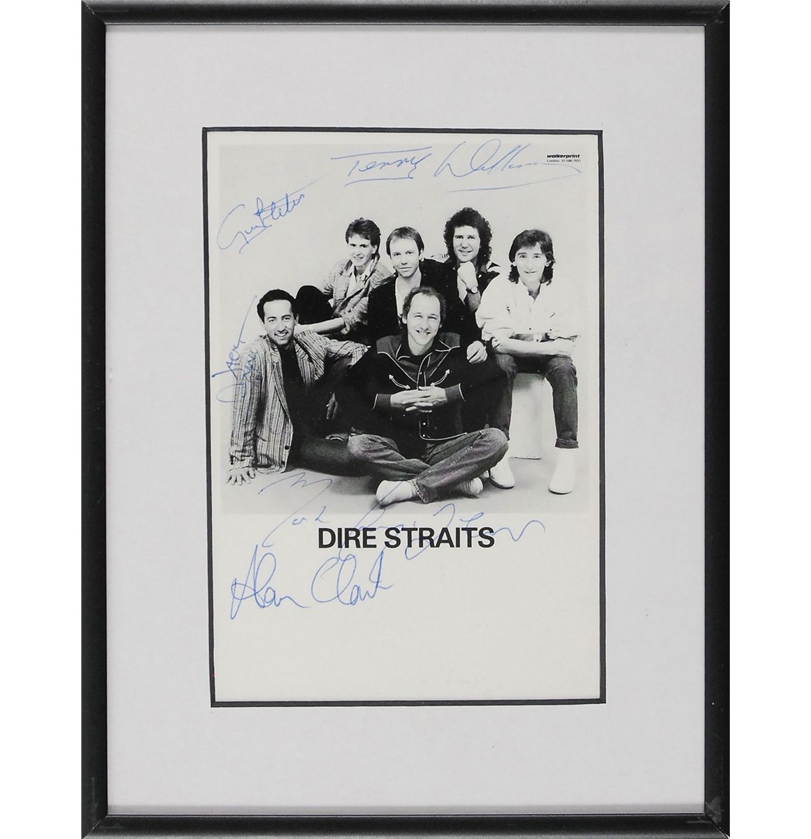 Desirable 4 x 6 cardstock publicity photo, signed in blue ballpoint by Mark Knopfler, Alan Clark, Terry Williams, Guy Fletcher, and Jack Sonni. Matted and framed to an overall size of 6.5 x 8.5. In fine condition.