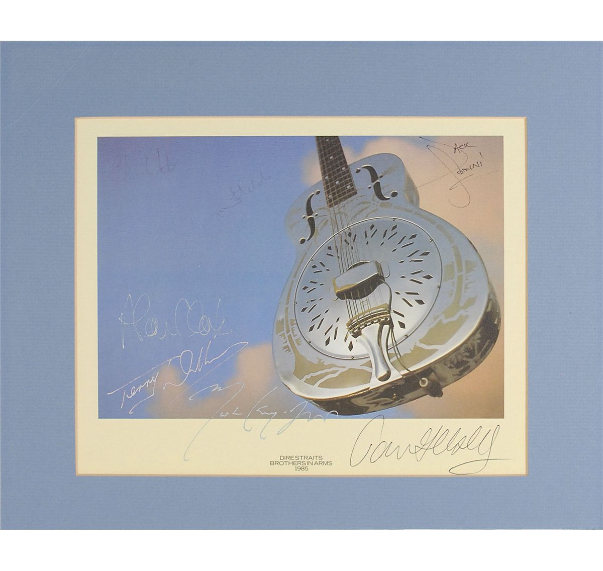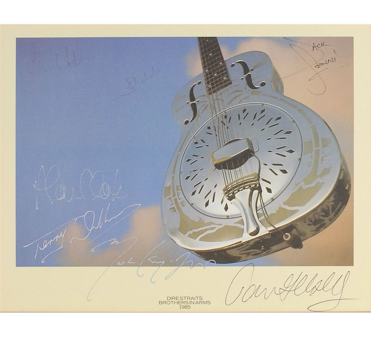 Color 11.5 x 9 print entitled ‘Brothers in Arms,’ signed in felt tip, ink, and ballpoint by Mark Knopfler, John Illsey, Terry Williams, Chris White, Alan Clark, Guy Fletcher, and Jack Sonni. Matted to an overall size of 15.5 x 12.5. Clark’s and Fletcher’s signatures very light, but still legible, otherwise fine condition.