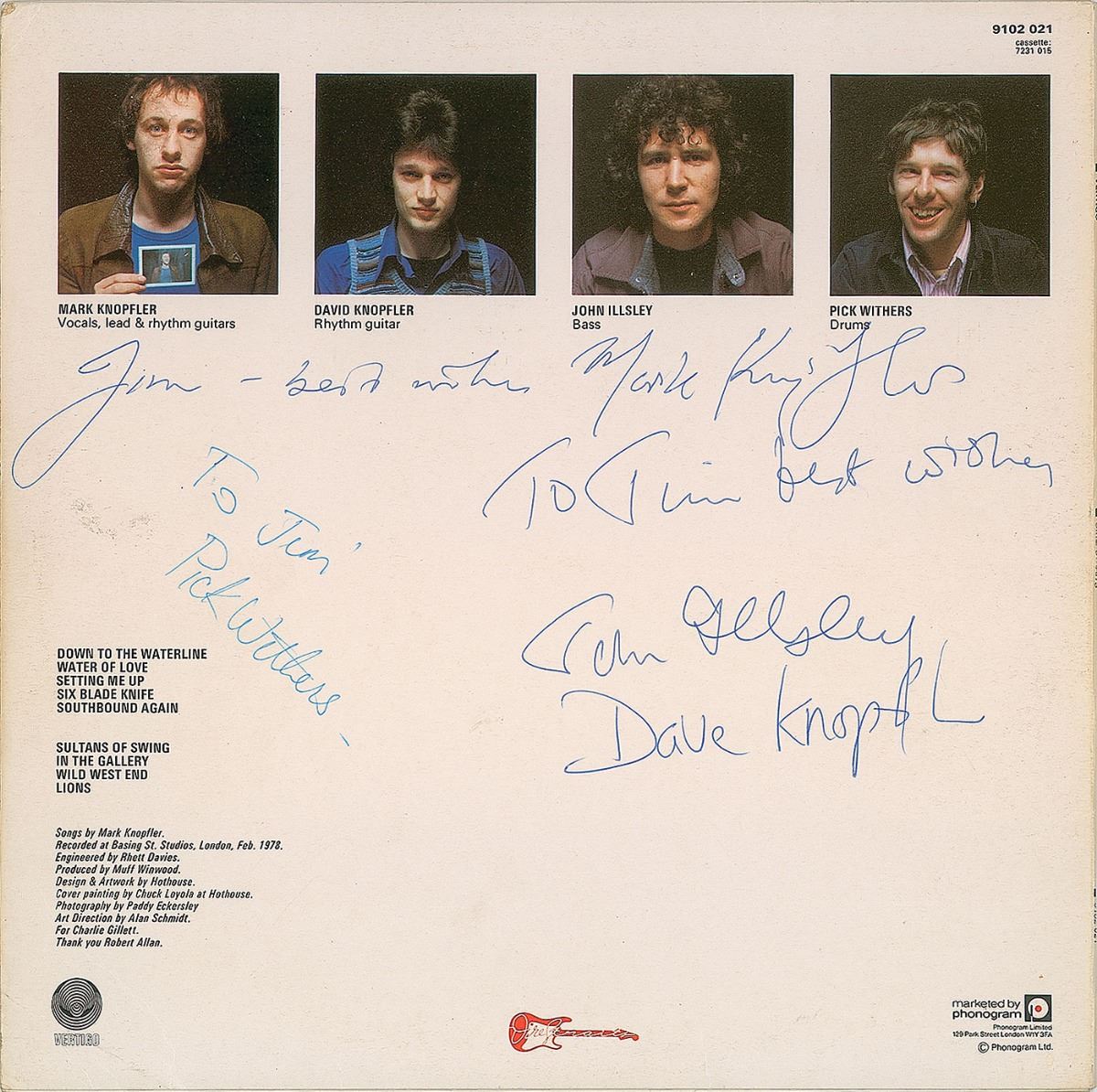Self-titled debut album signed and inscribed on the back cover in blue ballpoint, “Jim—best wishes, Mark Knopfler,” “To Jim, best wishes, John Illsley,” “Dave Knopfler,” and “To Jim, Pick Withers.” In fine condition. The record is not included. Accompanied by a full letter of authenticity from REAL.