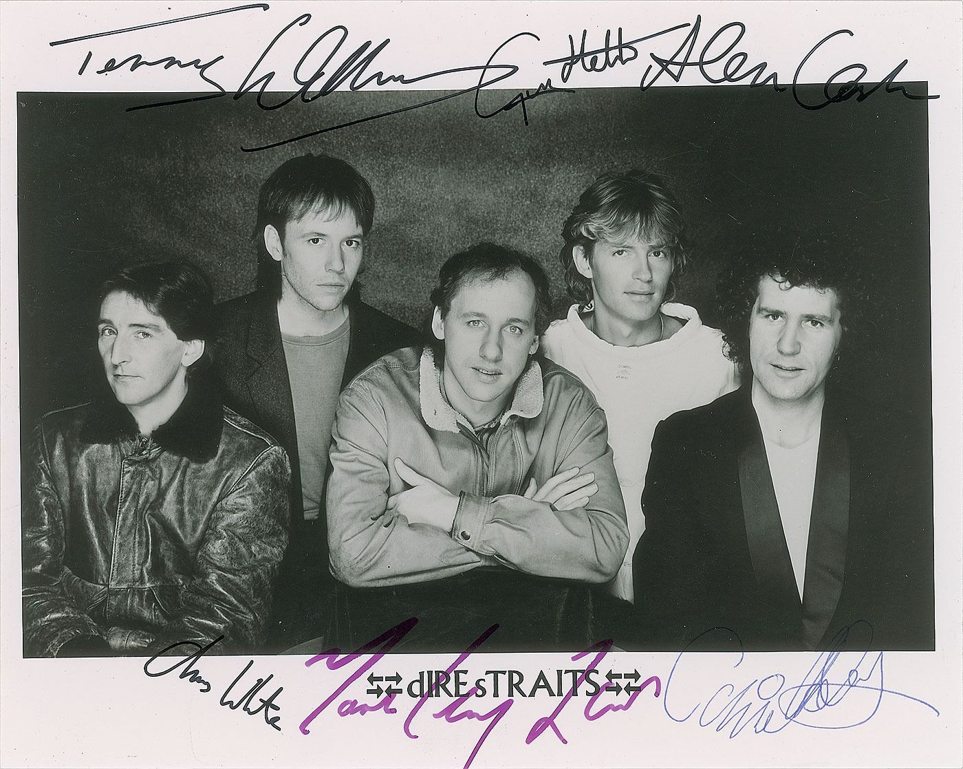 Glossy 10 x 8 publicity photo of Dire Straits, signed in black felt tip by Terry Williams, Alan Clark, Chris White, and Guy Fletcher, in purple felt tip by Mark Knopfler, and in blue ballpoint by John Illsley. In very good to fine condition, with a diagonal bend across the image.