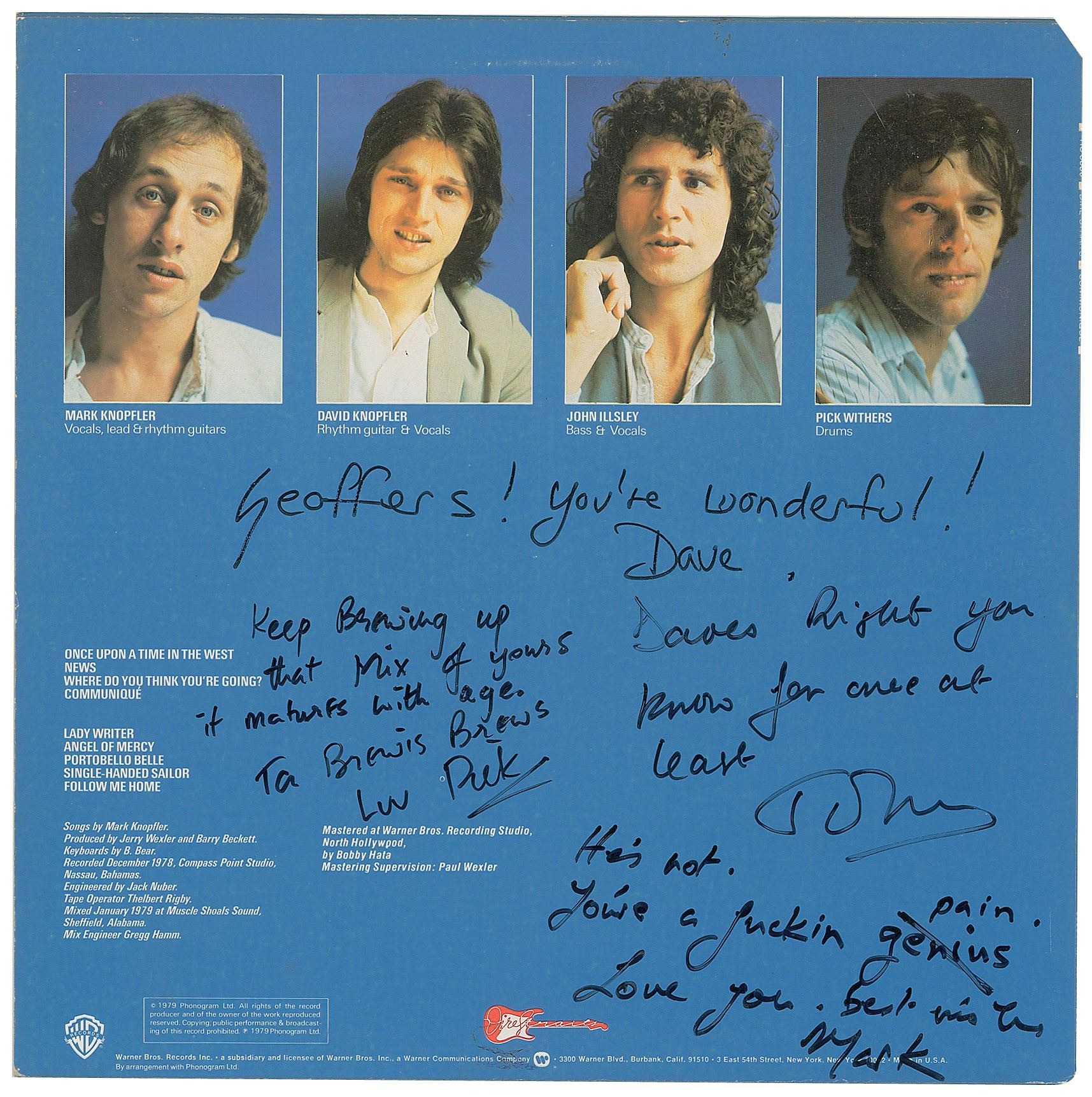 Communiqué album by Dire Straits, signed and inscribed on the back cover in black felt tip by Pick Withers ("Keep brewing up that mix of yours, it matures with age, To Brewis Brews, Luv Pick"), David Knopfler ("Geoffers! You're wonderful! Dave"), John Illsley ("Dave's right you know, for once at least, John"), and Mark Knopfler ("He's not, You're a fuckin pain [genius], Love you, best wishes, Mark"). In overall fine condition, with a clipped corner. The record is included. Accompanied by a program for Dire Straits' 1979 European Tour, listing the recipient of these autographs, Geoff Brewis, as a member of the road crew.