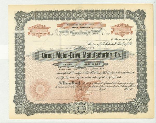 No date. New Jersey. A Direct Motor-Drive Manufacturing Co. Stock for 0 shares. Unissued, uncancelled and very fine.