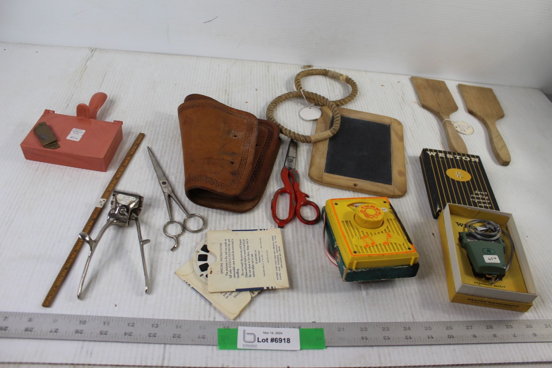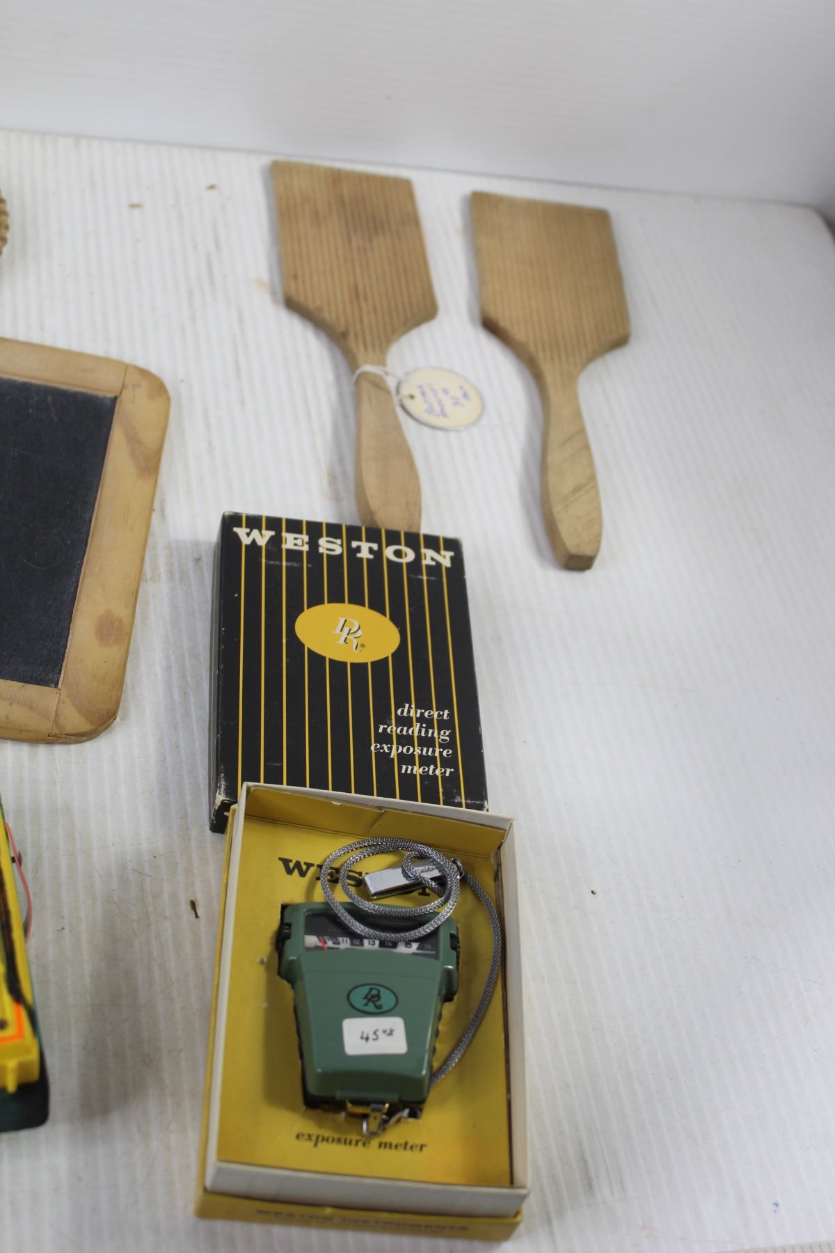 Direct Reading Exposure Meter, Boys Saddle Stirrups, Cigarette Box, Butter Paddles