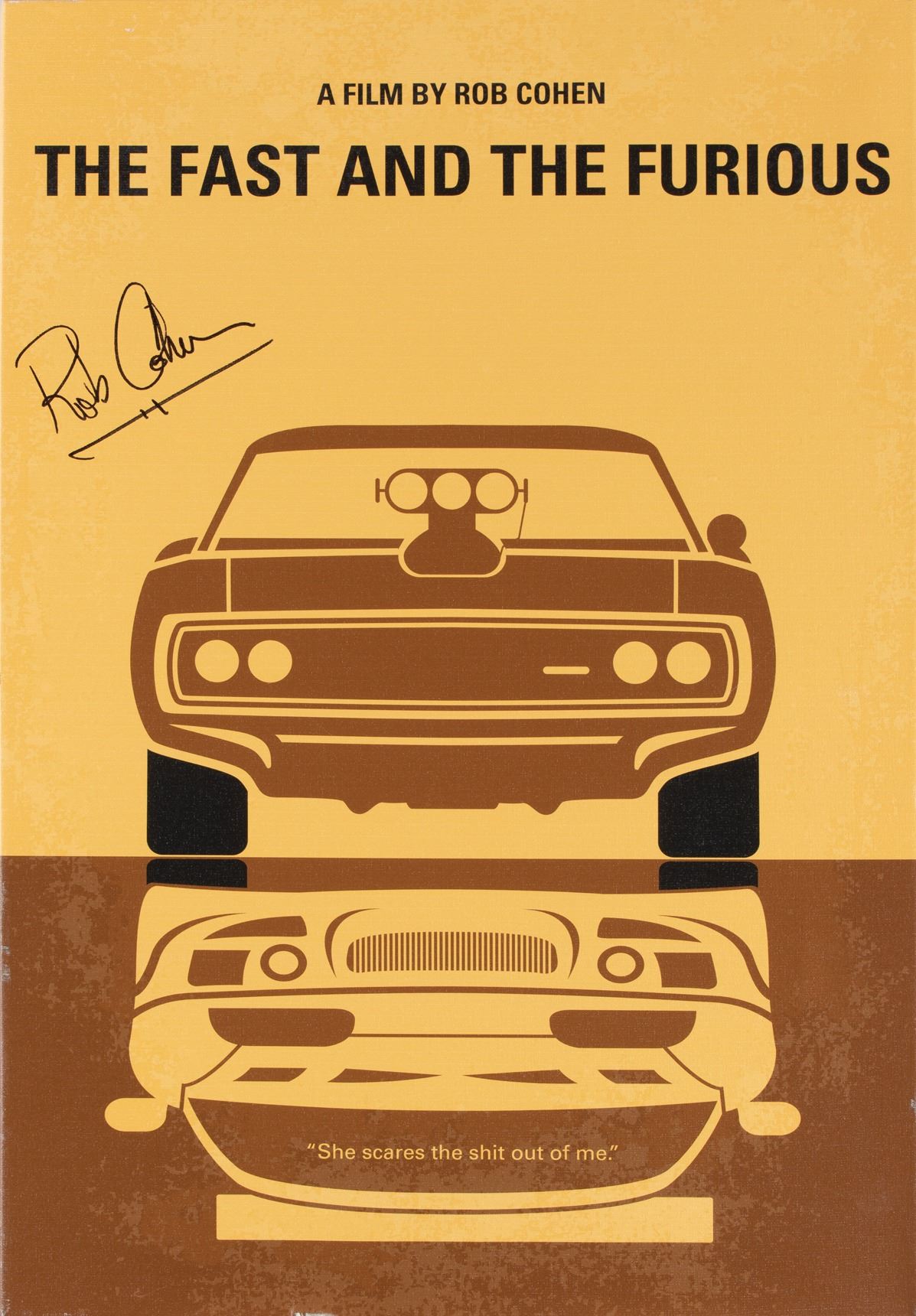 513. Director Rob Cohen's personal autographed retro The Fast and the Furious silkscreen canvas artwork. (Universal, 2001) Original retro 18 x 26 in. silkscreened canvas featuring the iconic 1968 Dodge Charger with "Dom's" (Vin Diesel) quote, "She scare the shit out of me", signed "Rob Cohen" upper left. Exhibiting some minor scuffing along edges, not obscuring the image. In very good to fine condition. Accompanied by a LOA signed by director Rob Cohen. $400 - $600