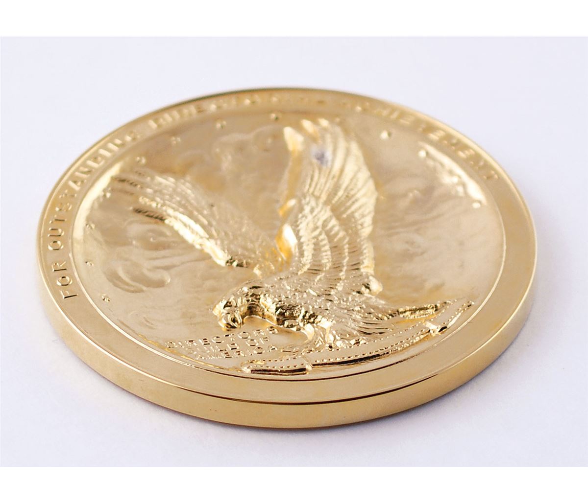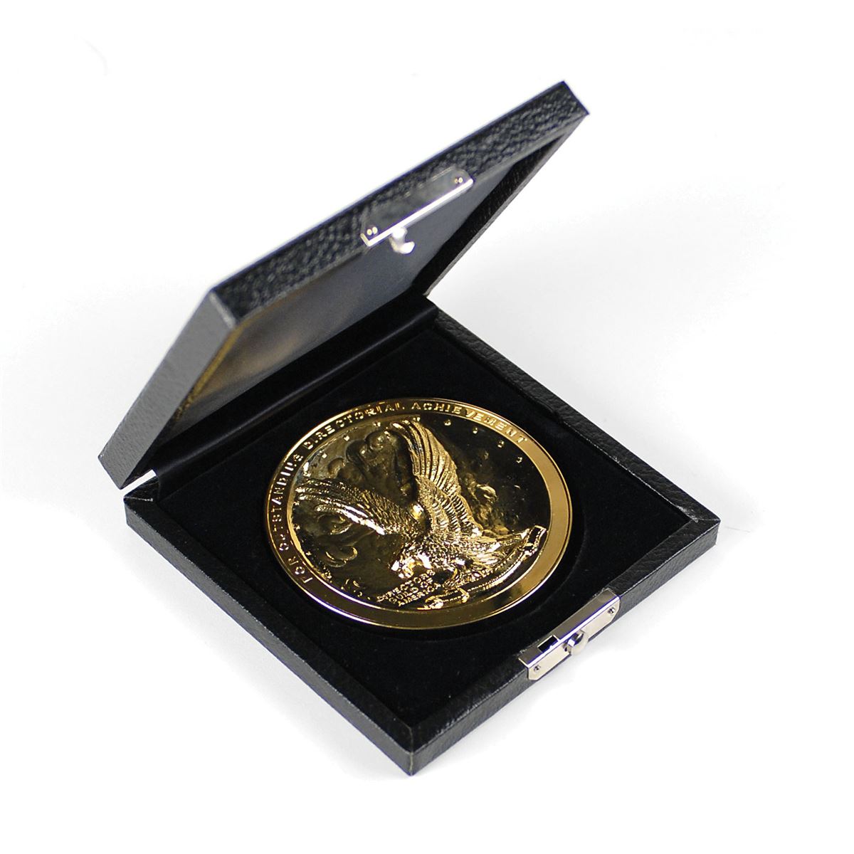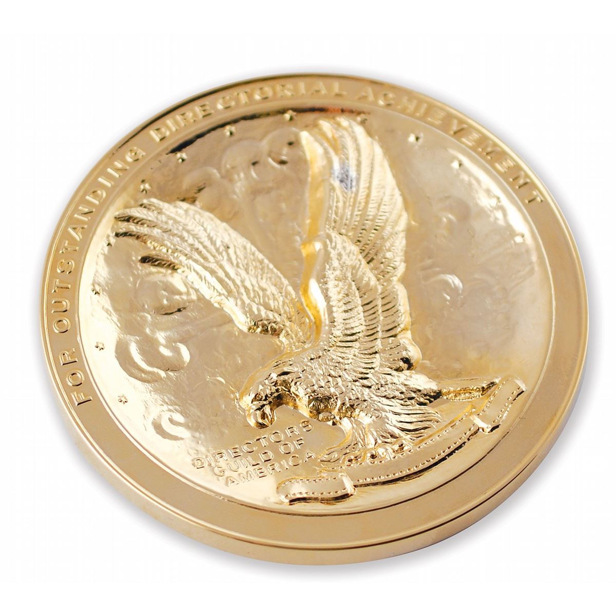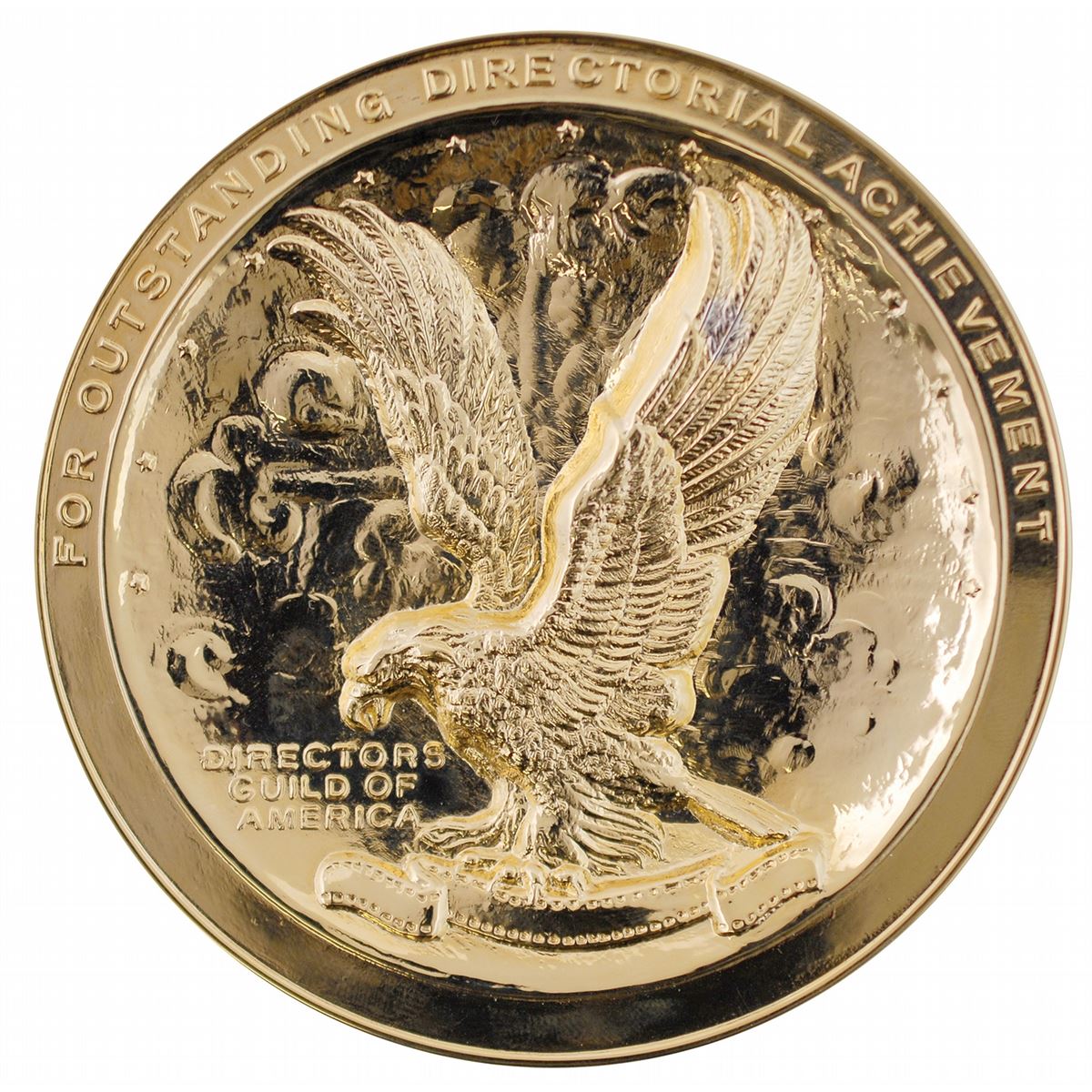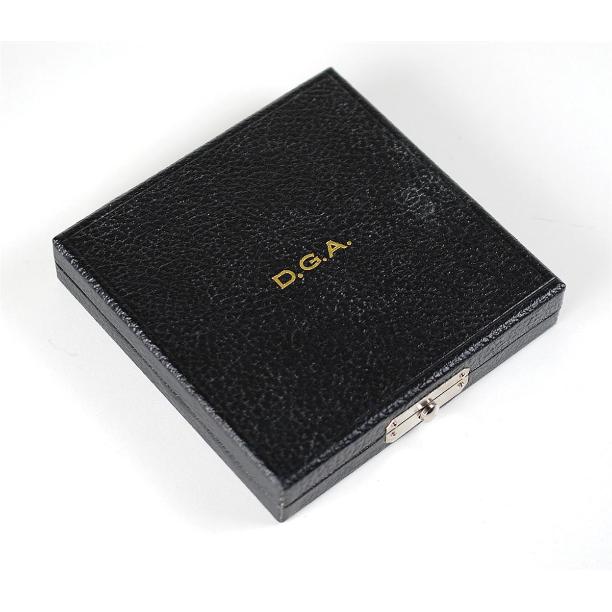 Impressive gold-plated Director’s Guild of America medallion, measuring 3.75? in diameter, featuring the Guild’s logo struck in deep relief encircled with the words, “For Outstanding Directorial Achievement.” When issued, the recipient’s name was generally engraved on the lower part of the circular rim. The reverse is blank with an affixed felt pad. In fine condition. Accompanied by the original presentation case, gilt stamped with the organization’s initials, “D. G. A.” The Directors Guild of America also awards much larger 12? diameter examples of this medal; though little is known about these awards, it seems that the large version is given to the winner, while the small version is given as a recognition of the nomination.