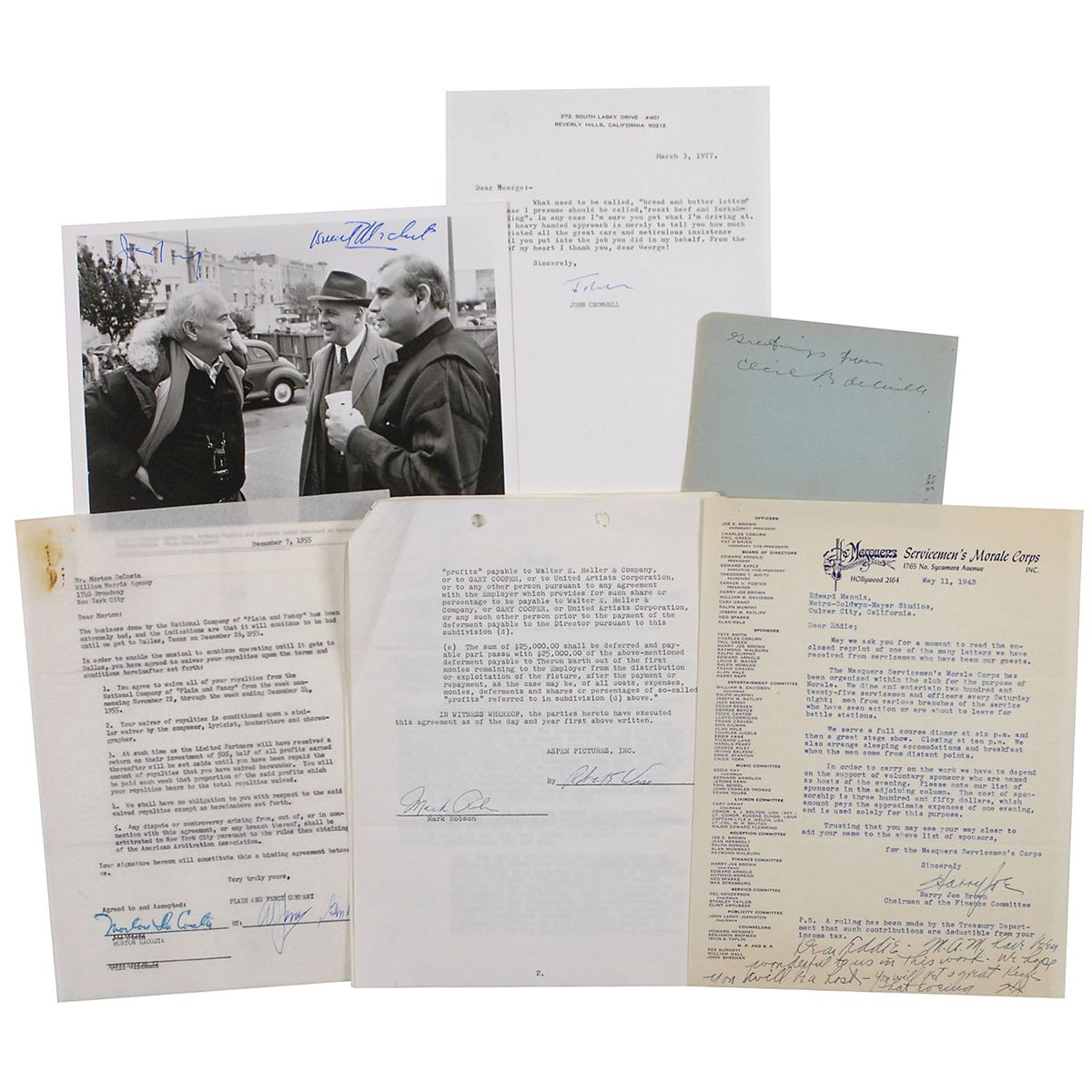 Six items: vintage fountain pen signature, “Greetings from Cecil B. deMille,” on a light blue 5.75 x 4.5 album page; glossy 10 x 8 promotional photo for The Remains of the Day, signed in blue felt tip by James Ivory and Ismail Merchant; TLS by John Cromwell, signed “John,” one page, 7.25 x 10.5, personal letterhead, March 3, 1977. In part: “What used to be called, ‘bread and butter letters,’ in my case I presume should be called, ‘roast beef and Yorkshire pudding’”; TLS by Harry Joe Brown, signed “Harry Joe,” one page, 8.5 x 11, Serviceman’s Morale Corps letterhead, May 11, 1943. Letter to MGM exec Eddie Mannix, soliciting donations; DS, signed “Morton DaCosta,” one onionskin page, 8.5 x 11, December 7, 1955, regarding royalties from the ‘Plain and Fancy’ theatre company; and a DS signed “Robert E. Wise,” two pages, 8.5 x 11, July 2, 1952. Agreement between Aspen Pictures and Mark Robson for him to “direct the motion picture now entitled ‘Return to Paradise.’” In overall very good to fine condition.