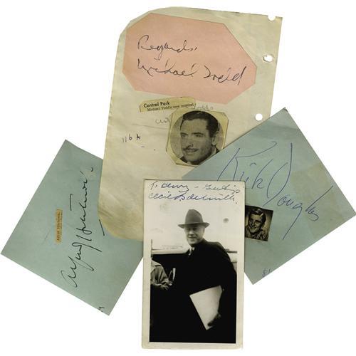 <B>Directors Autographs.</B></I> Four legendary directors are represented in this lot. Included are a snapshot of Cecil B. DeMille (with his characteristic "Greetings" in the inscription), and album pages signed by Otto Preminger, Michael Todd (attached to a larger paper with newspaper photo attached) and Alfred Hitchcock. Bonuses: the verso of the Todd has the autograph of MGM starlet Jay Merrill and musician Victor Lombardo (Guy's brother), the back of the Hitchcock has the signature of actor Monty Collins, and the flip side of the Preminger has the autograph of Kirk Douglas (with small picture attached). There's an awesome sum total of Hollywood history and talent in this lot. <I>With COA from PSA/DNA.</B></I>