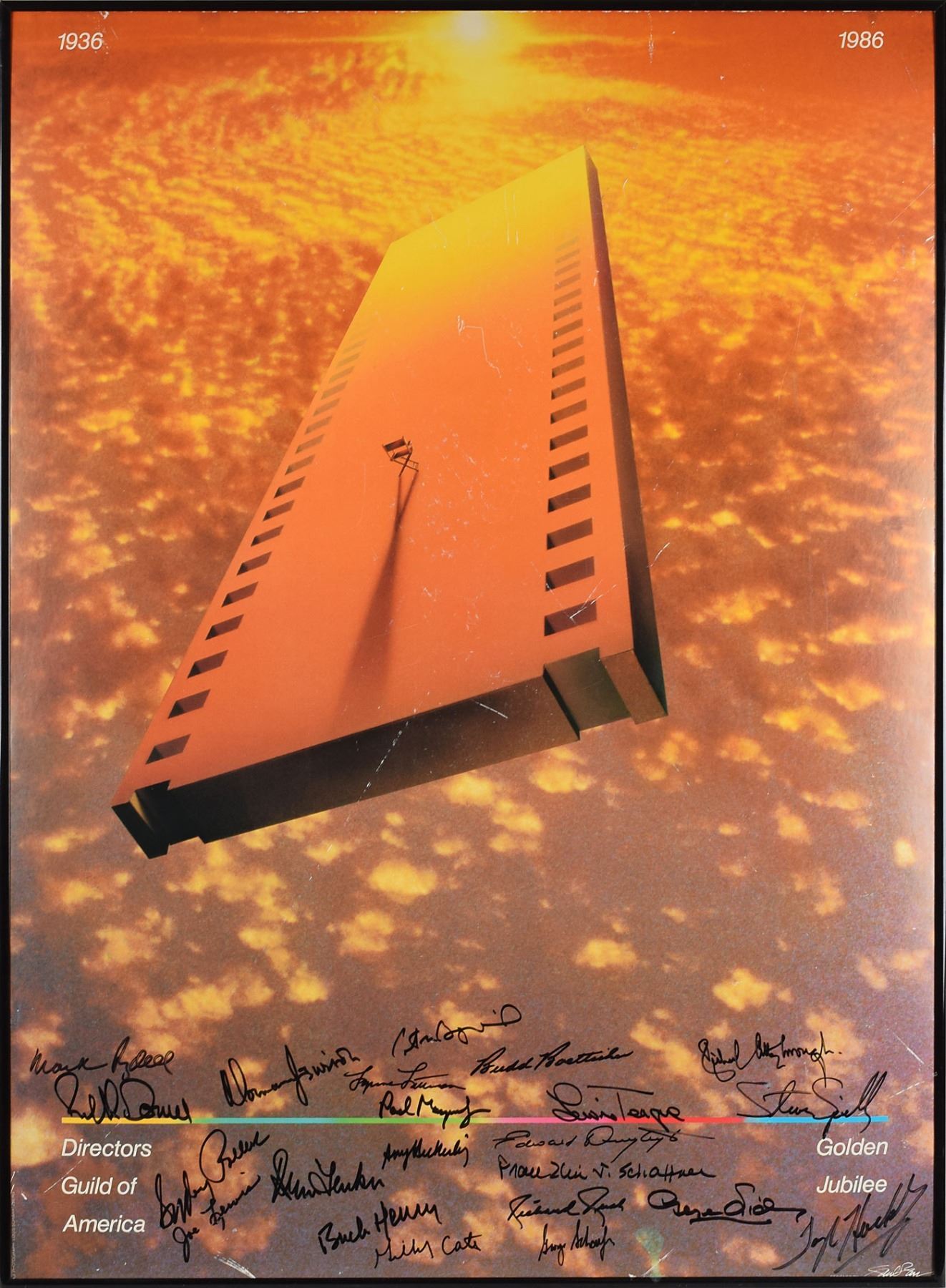 Color poster promoting the 1986 Golden Jubilee of the Directors Guild of America, showing a large floating film clip with a solitary director's chair, signed below in black felt tip by 22 notable directors, including: Steven Spielberg, Sydney Pollack, Richard Attenborough, Richard Donner, Amy Heckerling, Buck Henry, Budd Boetticher, Edward Dmytryk, Franklin J. Schaffner, George Schaefer, George Sidney, Gilbert Cates, Joseph H.Lewis, Lewis Teague, Lynne Littman, Mark Rydell, Norman Jewison, Paul Mazursky, Peter Bogdanovich, Richard Rush, Taylor Hackford, and one other. Framed without glass, and in very good to fine condition, with scattered light scratching. Accompanied by full letters of authenticity from PSA/DNA and Beckett Authentication Services.